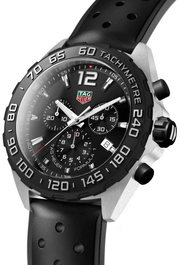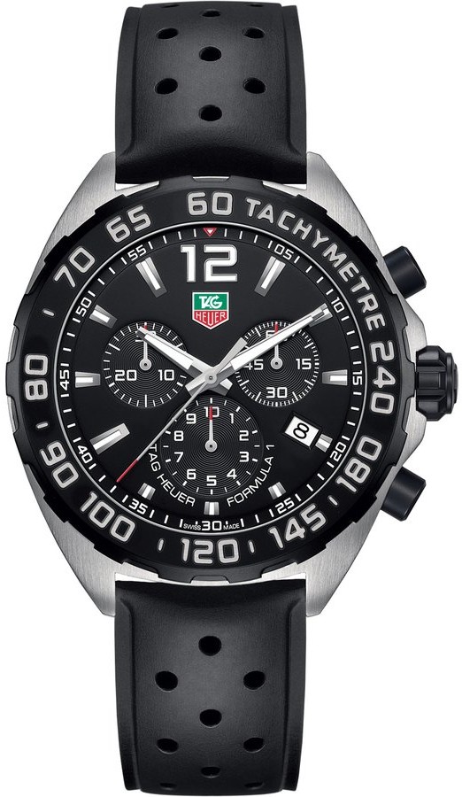 Tag Heuer Formula 1 Chronograph CAZ1010.FT8024 sú pánske športové hodinky na čiernom perforovanom kaučukovom remienku s tŕňovou sponou. Oceľové puzdro má priemer 43 milimetrov, otočnú lunetu s tachymetrickou stupnicou a skrutkovaciu korunku. Čierny číselník s ukazovateľom dátumu, priebežnou sekundovkou a sčítačmi stopiek je chránený odolným zafírovým sklom. Ručičky a indexy sú ošetrené náterom Super-LumiNova® pre čo najlepšiu možnú čitateľnosť za zhoršených svetelných podmienok. Pohon hodiniek zaisťuje švajčiarsky quartzový strojček. S vodotesnosťou 20 ATM sú hodinky vhodné na prístrojové potápanie.