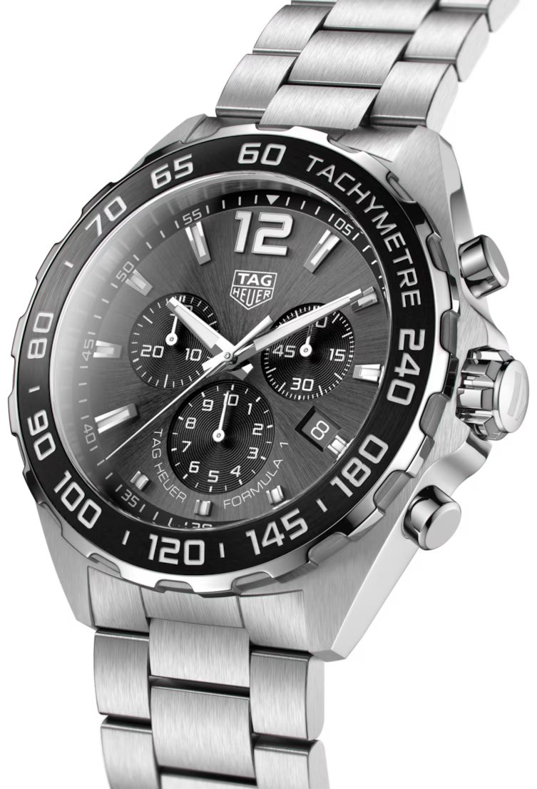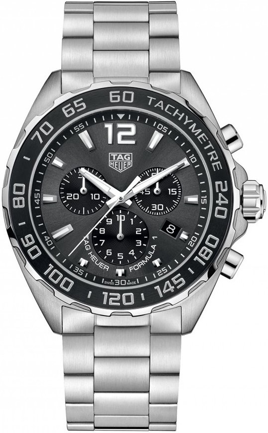 Tag Heuer Formula 1 Chronograph CAZ1011.BA0842 sú pánske športové hodinky na oceľovom náramku s preklápacou sponou. Oceľové puzdro má priemer 43 milimetrov, otočnú lunetu s tachymetrickou stupnicou a skrutkovaciu korunku. Antracitový číselník s efektom slnečného brúsu, ukazovateľom dátumu, priebežnou sekundovkou a čiernymi sčítačmi stopiek je chránený odolným zafírovým sklom. Ručičky a indexy sú ošetrené náterom Super-LumiNova® pre čo najlepšiu možnú čitateľnosť za zhoršených svetelných podmienok. Pohon hodiniek zaisťuje švajčiarsky quartzový strojček. S vodotesnosťou 20 ATM sú hodinky vhodné na prístrojové potápanie.