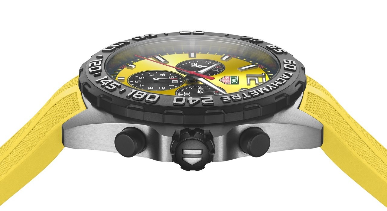 Tag Heuer Formula 1 Chronograph CAZ101AM.FT8054 sú pánske športové hodinky na žltom kaučukovom remienku s tŕňovou sponou. Oceľové puzdro má priemer 43 milimetrov, otočnú lunetu s tachymetrickou stupnicou a skrutkovaciu korunku. Žltý číselník s efektom slnečného brúsu, ukazovateľom dátumu, priebežnou sekundovkou a čiernymi sčítačmi stopiek je chránený odolným zafírovým sklom. Ručičky a indexy sú ošetrené náterom Super-LumiNova® pre čo najlepšiu možnú čitateľnosť za zhoršených svetelných podmienok. Pohon hodiniek zaisťuje švajčiarsky quartzový strojček. S vodotesnosťou 20 ATM sú hodinky vhodné na prístrojové potápanie.