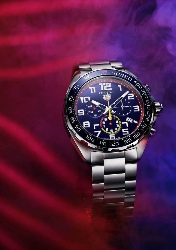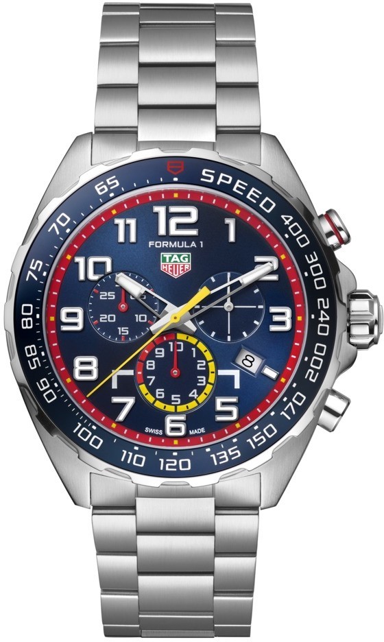 Tag Heuer Formula 1 Chronograph & Red Bull Racing Special Edition CAZ101AL.BA0842 sú pánske športové hodinky na oceľovom náramku s preklápacou sponou. Oceľové puzdro má priemer 43 milimetrov, otočnú lunetu s tachymetrickou stupnicou a skrutkovaciu korunku. Modrý číselník s efektom slnečného brúsu, ukazovateľom dátumu, priebežnou sekundovkou a sčítačmi stopiek je chránený odolným zafírovým sklom. Ručičky a indexy sú ošetrené náterom Super-LumiNova® pre čo najlepšiu možnú čitateľnosť za zhoršených svetelných podmienok. Pohon hodiniek zaisťuje švajčiarsky quartzový strojček. S vodotesnosťou 20 ATM sú hodinky vhodné na prístrojové potápanie. Hodinky sú dodávané v špeciálnej krabičke vo farbách typických pre Red Bull Racing.