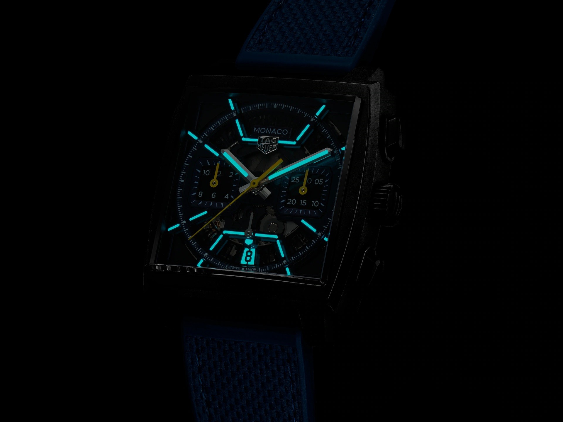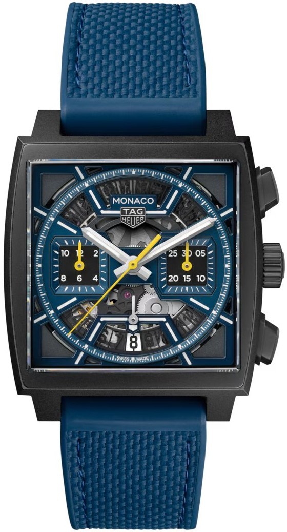Tag Heuer Monaco CBL2188.FT6261 sú pánske luxusné športové hodinky na modrom remienku v kombinácii kaučuku, textilu a podšívky z kože s preklápacou sponou. Hranaté titánové puzdro široké 39 milimetrov má povrchovú DLC úpravu čiernej farby a priehľadné viečko ponúkajúce pohľad na automatický strojček dekorovaný ženevskými pruhmi. Čierno-modrý skeletónový číselník s dátumovkou na šiestej hodine, priebežnou sekundovkou a dvoma subciferníkmi s funkciou stopiek je chránený odolným zafírovým sklom s antireflexnou vrstvou. Ručičky, indexy a ďalšie prvky na číselníku sú ošetrené náterom Super-LumiNova® pre čo najlepšiu možnú čitateľnosť za zhoršených svetelných podmienok. Pohon hodiniek zaisťuje švajčiarsky mechanický strojček TH20-00s automatickým náťahom a rezervou chodu 80 hodín. S vodotesnosťou 10 ATM sú hodinky vhodné na plávanie a šnorchlovanie.