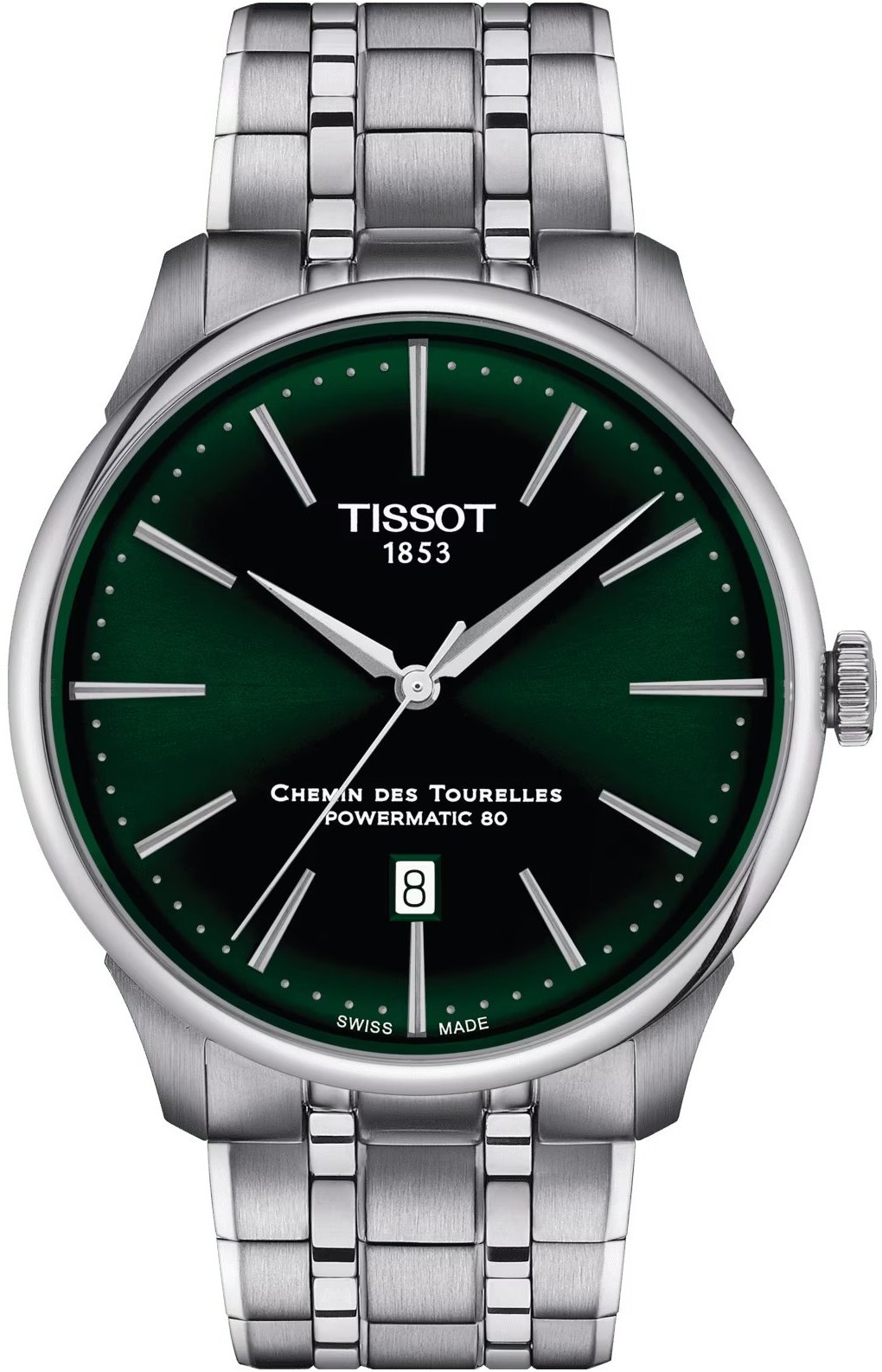 Tissot Chemin des Tourelles Powermatic 80 T139.407.11.091.00 sú pánske automatické hodinky v klasickom štýle na oceľovom náramku s motýlikovou sponou. Puzdro z nerezovej ocele má priemer 42 milimetrov a priehľadné viečko. Tmavozelený číselník s efektom slnečného brusu a indikáciou dátumu na šiestej hodine je chránený odolným zafírovým sklom s antireflexnou vrstvou. Chod hodiniek zaisťuje mechanický strojček Powermatic 80.111 s automatickým náťahom a rezervou chodu 80 hodín. Tento strojček s funkciou hackingu (zastavenie sekundovej rúčky pri vytiahnutí korunky do krajnej polohy) je možné v prípade potreby naťahovať aj ručne pomocou korunky. S vodotesnosťou 5 ATM sú hodinky odolné proti dažďu a pri sprchovaní.