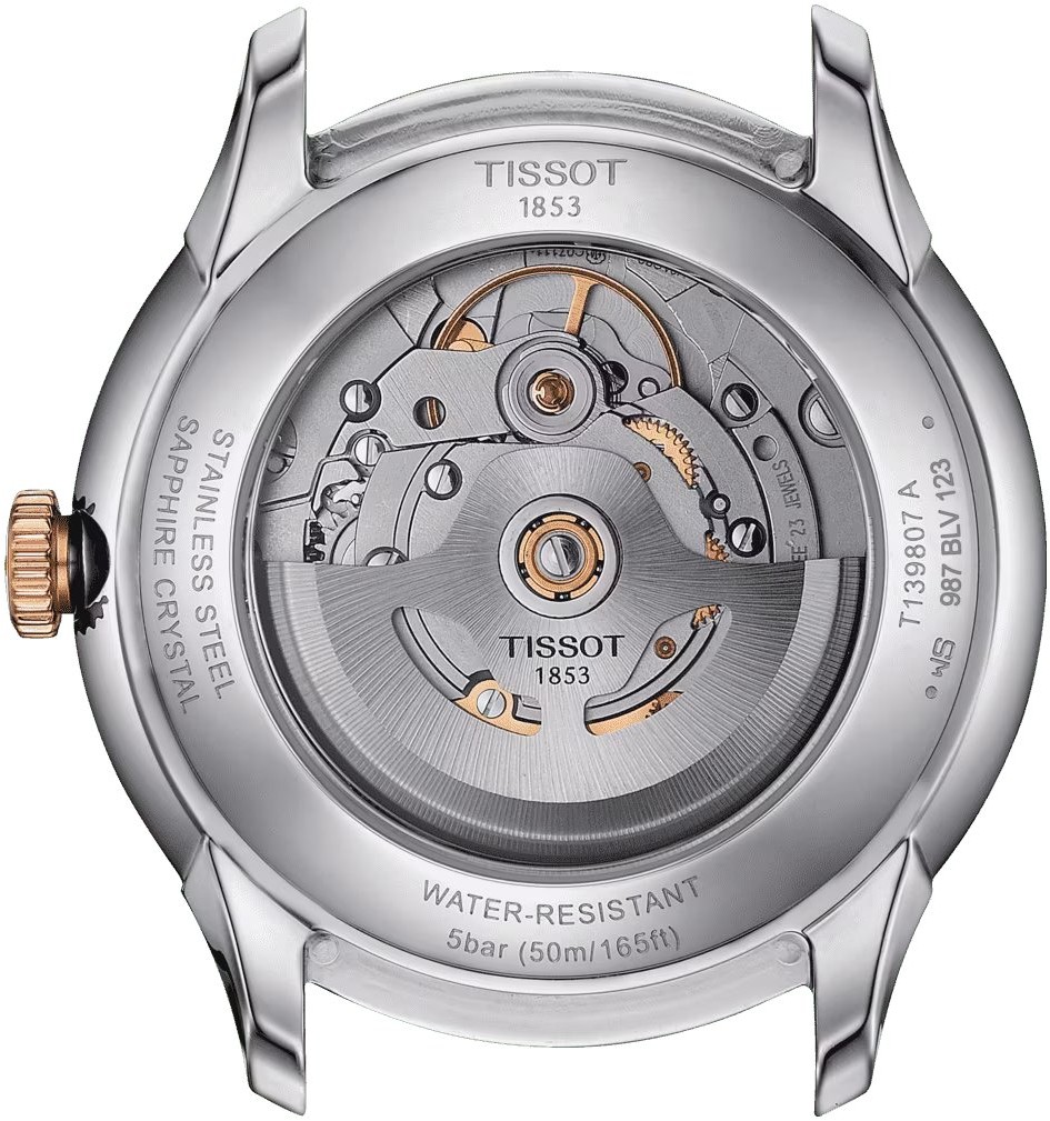 Tissot Chemin des Tourelles Powermatic 80 T139.807.22.038.00 sú unisex automatické hodinky v klasickom štýle na oceľovom bicolor náramku s motýlikovou sponou. Dva rady náramku, luneta a korunka disponujú povrchovou PVD úpravou vo farbe ružového zlata ladiacej s ručičkami a indexmi. Puzdro z nerezovej ocele má priemer 39 milimetrov a priehľadné viečko. Texturovaný strieborný číselník so stredom s efektom slnečného brusu a indikáciou dátumu na šiestej hodine je chránený odolným zafírovým sklom s antireflexnou vrstvou. Chod hodiniek zaisťuje mechanický strojček Powermatic 80.111 s automatickým náťahom a rezervou chodu 80 hodín. Tento strojček s funkciou hackingu (zastavenie sekundovej rúčky pri vytiahnutí korunky do krajnej polohy) je možné v prípade potreby naťahovať aj ručne pomocou korunky. S vodotesnosťou 5 ATM sú hodinky odolné proti dažďu a pri sprchovaní.