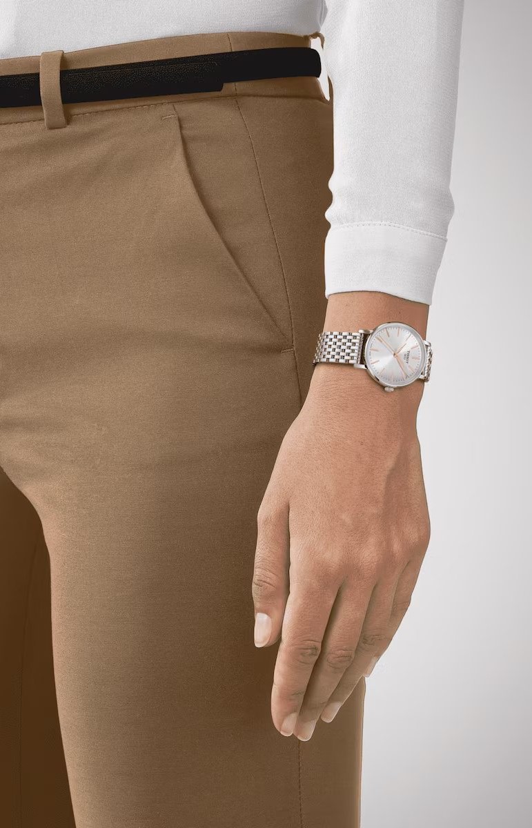 Tissot Everytime Lady T143.210.11.011.01 sú dámske batériové hodinky v klasickom štýle na oceľovom náramku s motýlikovou sponou. Puzdro z nerezovej ocele má priemer 34 milimetrov. Strieborný číselník s efektom slnečného brusu a rúčkami a indexmi v zlatej farbe je chránený odolným zafírovým sklom. Pohon hodiniek zaisťuje quartzový strojček ETA F05.412 PreciDrive s presnosťou ± 10 sekúnd za rok. S vodotesnosťou 5 ATM sú hodinky odolné proti dažďu a pri sprchovaní.