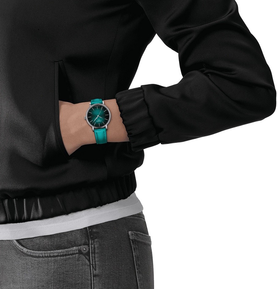 Tissot Everytime Lady T143.210.17.091.00 sú dámske elegantné batériové hodinky na tyrkysovo zelenom koženom remienku s tŕňovou sponou. Puzdro z nerezovej ocele má priemer 34 milimetrov. Gradientný zeleno-modrý číselník s efektom slnečného brusu je chránený odolným zafírovým sklom. Pohon hodiniek zaisťuje quartzový strojček ETA F05.412 PreciDrive s presnosťou ± 10 sekúnd za rok. S vodotesnosťou 5 ATM sú hodinky odolné proti dažďu a pri sprchovaní.
