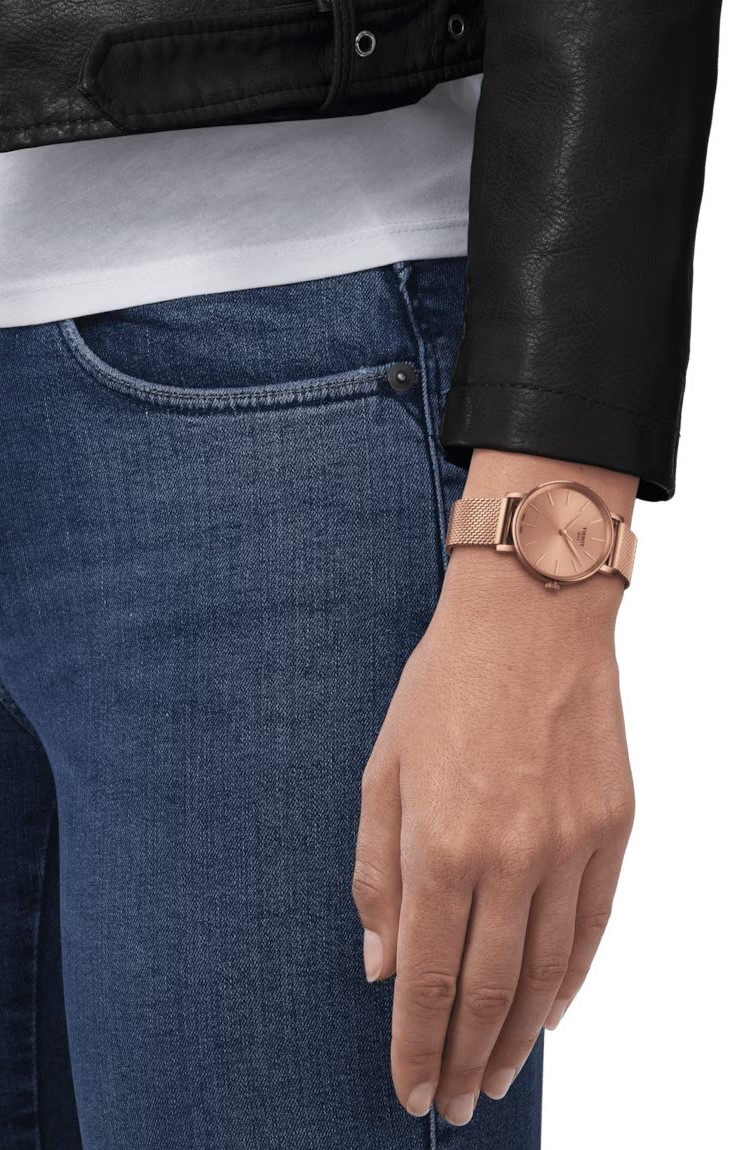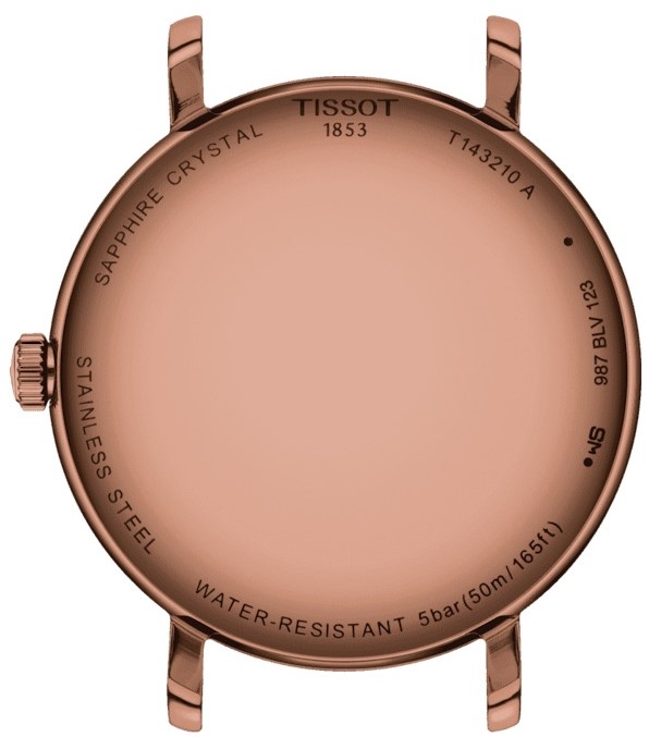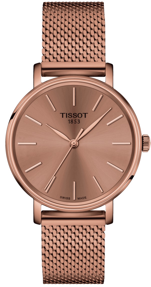 Tissot Everytime Lady T143.210.33.331.00 sú dámske elegantné batériové hodinky na oceľovom milánskom ťahu s povrchovou PVD úpravou vo farbe ružového zlata a posuvnou sponou. Puzdro z nerezovej ocele v rovnakej farbe má priemer 34 milimetrov. Číselník vo farbe ružového zlata s efektom slnečného brusu je chránený odolným zafírovým sklom. Pohon hodiniek zaisťuje quartzový strojček ETA F05.412 PreciDrive s presnosťou ± 10 sekúnd za rok. S vodotesnosťou 5 ATM sú hodinky odolné proti dažďu a pri sprchovaní.