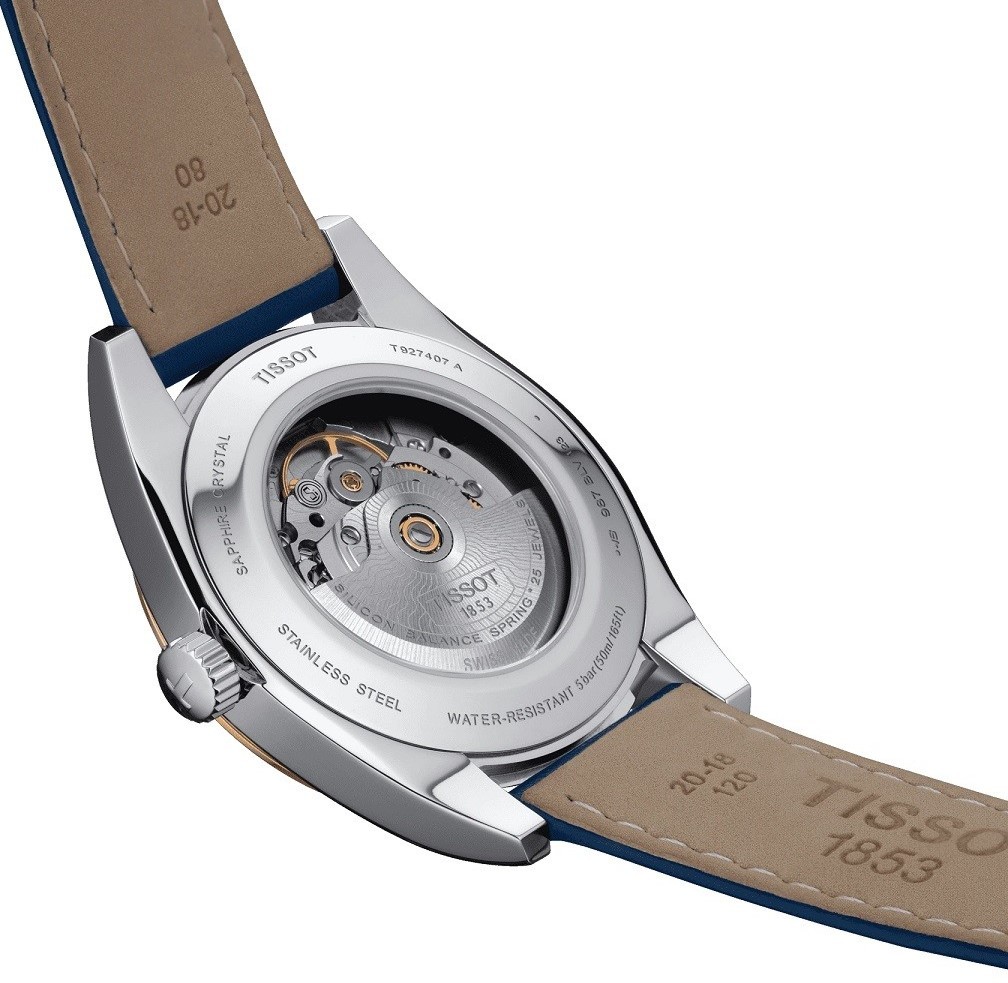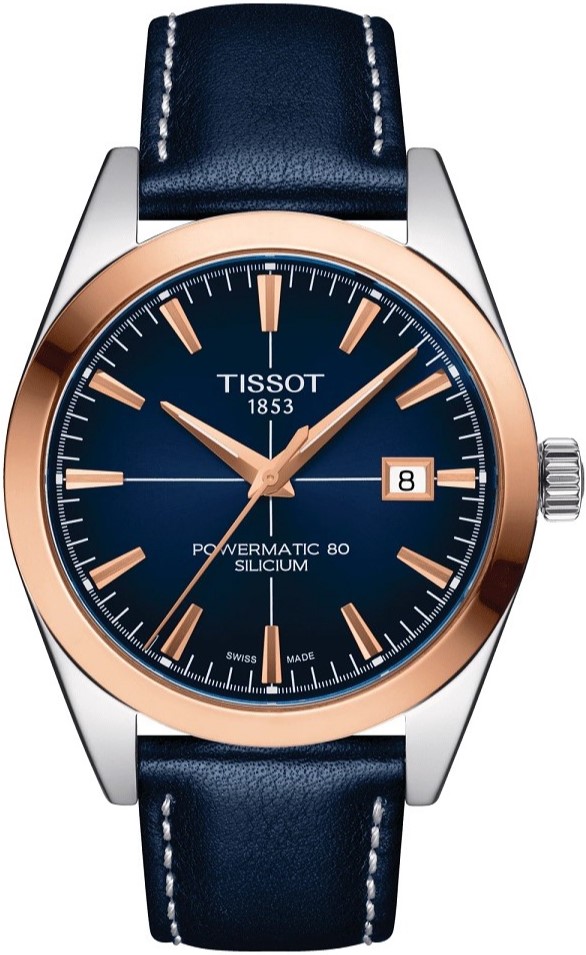 Tissot Gentleman Powermatic 80 Silicium T927.407.46.041.00 sú pánske elegantné automatické hodinky na modrom koženom remienku s kontrastným prešívaním a motýlikovou sponou. Puzdro z nerezovej ocele má priemer 40 milimetrov, priehľadné viečko a lunetu vyrobenú z 18 karátového ružového zlata. Tmavomodrý číselník s efektom slnečného brusu a ukazovateľom dátumu je chránený odolným zafírovým sklom. Pohon hodiniek zaisťuje mechanický strojček Powermatic 80.811 s automatickým náťahom a rezervou chodu 80 hodín. S vodotesnosťou 5 ATM sú hodinky odolné proti dažďu a pri sprchovaní.