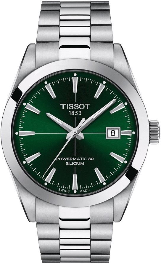 Tissot Gentleman Powermatic 80 Silicium T127.407.11.091.01 sú pánske automatické hodinky na oceľovom náramku v kombinácii brusu a lesku s motýlikovou sponou. Puzdro z nerezovej ocele má priemer 40 milimetrov a priehľadné viečko. Zelený číselník s efektom slnečného brusu a indikáciou dátumu je chránený odolným zafírovým sklom s antireflexnou vrstvou. Aplikované hodinové indexy sú rovnako ako ručičky pokryté luminiscenčným náterom Super-LumiNova®, ktorý garantuje perfektnú čitateľnosť za zhoršených svetelných podmienok. Pohon hodiniek zaisťuje mechanický strojček Powermatic 80.811 s automatickým náťahom a rezervou chodu približne 80 hodín, ktorý disponuje funkciou hackingu (zastavenie sekundovej ručičky pri vytiahnutí korunky do krajnej polohy) a je možné ho v prípade potreby naťahovať aj ručne pomocou korunky. Vďaka použitiu kremíkového antimagnetického vlásku zotrvačky je tento kaliber vysoko odolný voči vplyvom magnetického poľa. S vodotesnosťou 10 ATM sú hodinky vhodné na kúpanie alebo šnorchlovanie.