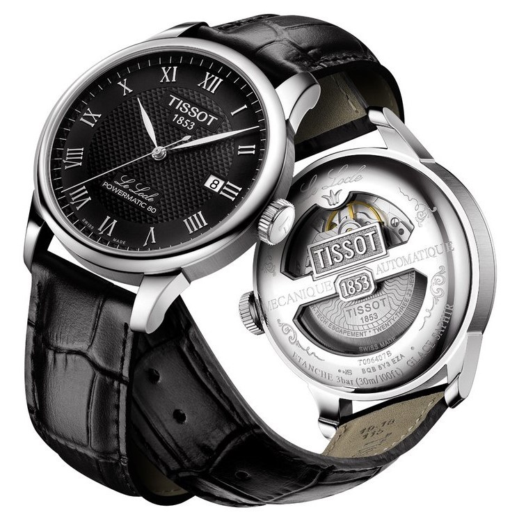 Tissot Le Locle Powermatic 80 T006.407.16.053.00 sú pánske elegantné automatické hodinky na čiernom koženom remienku s motýlikovou sponou. Puzdro z nerezovej ocele má priemer 39,3 milimetra a priehľadné viečko. Čierny štruktúrovaný číselník s ukazovateľom dátumu na tretej hodine je chránený odolným zafírovým sklom. Pohon hodiniek zaisťuje mechanický strojček Powermatic 80.111 s automatickým náťahom a rezervou chodu 80 hodín. S vodotesnosťou 3 ATM sú hodinky odolné proti dažďu a pri umývaní rúk.