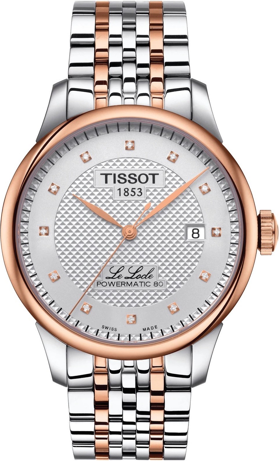 Tissot Le Locle Powermatic 80 T006.407.22.036.01 sú pánske automatické hodinky v klasickom štýle na oceľovom bicolor náramku s motýlikovou sponou. Časti náramku, luneta a korunka disponujú povrchovou PVD úpravou vo farbe ružového zlata. Puzdro z nerezovej ocele má priemer 39,3 milimetra a priehľadné viečko. Strieborný štruktúrovaný číselník s ukazovateľom dátumu na tretej hodine a 12 diamantmi s hmotnosťou 0,06 ct a čistote VS-SI je chránený odolným zafírovým sklom. Pohon hodiniek zaisťuje mechanický strojček Powermatic 80.111 s automatickým náťahom a rezervou chodu 80 hodín. S vodotesnosťou 3 ATM sú hodinky odolné proti dažďu a pri umývaní rúk.
