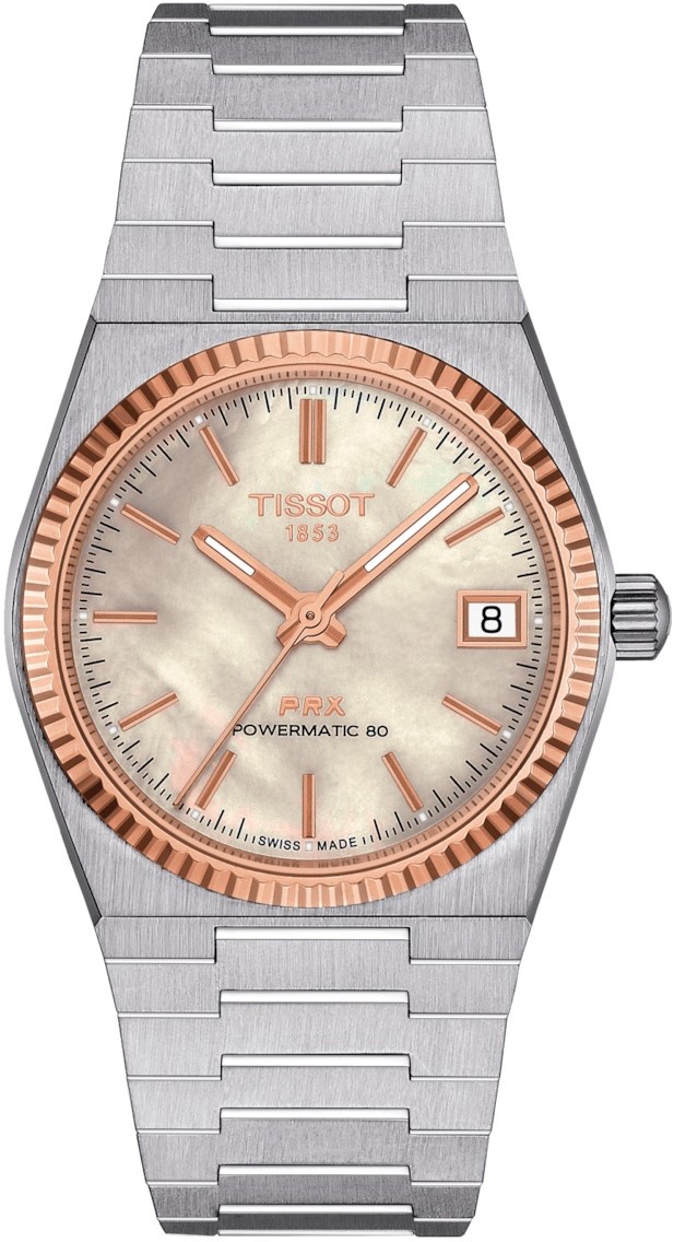 Tissot PRX Powermatic 80 T931.207.41.111.00 sú dámske automatické hodinky na integrovanom oceľovom náramku s brúsenou povrchovou úpravou a motýlikovou sponou. Puzdro z nerezovej ocele má priemer 35 milimetrov, priehľadné viečko a lunetu z 18k ružového zlata. Perleťový číselník s efektom slnečného brusu a indikáciou dátumu je chránený odolným zafírovým sklom s antireflexnou vrstvou a jeho krása vyniká najmä pod priamym svetlom, kedy môžeme pozorovať hru farieb perlete. Aplikované hodinové indexy sú rovnako ako ručičky pokryté luminiscenčným náterom Super-LumiNova®, ktorý garantuje perfektnú čitateľnosť za zhoršených svetelných podmienok. Pohon hodiniek zaisťuje mechanický strojček Powermatic 80 s automatickým náťahom a rezervou chodu približne 80 hodín. Vďaka použitiu antimagnetického vlásku zotrvačky Nivachron™ z titánovej zliatiny, na ktorého vývoji sa spolu so Swatch Group podieľala manufaktúra Audemars Piguet, je tento kaliber vysoko odolný voči vplyvom magnetického poľa. Tento strojček s funkciou hackingu možno v prípade potreby naťahovať aj ručne pomocou signovanej korunky. Vodotesnosť hodiniek je 10 ATM a sú vhodné na kúpanie alebo šnorchlovanie.