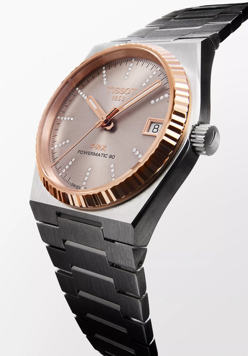 Tissot PRX Powermatic 80 T931.207.41.336.00 sú dámske automatické hodinky na integrovanom oceľovom náramku s brúsenou povrchovou úpravou a motýlikovou sponou. Puzdro z nerezovej ocele má priemer 35 milimetrov, priehľadné viečko a lunetu z 18k ružového zlata. Strieborný číselník s efektom slnečného brusu, indikáciou dátumu a 44 diamantmi o hmotnosti 0,0704 ct a čistote VS-SI je chránený odolným zafírovým sklom s antireflexnou vrstvou. Aplikované hodinové indexy sú rovnako ako ručičky pokryté luminiscenčným náterom Super-LumiNova®, ktorý garantuje perfektnú čitateľnosť za zhoršených svetelných podmienok. Pohon hodiniek zaisťuje mechanický strojček Powermatic 80 s automatickým náťahom a rezervou chodu približne 80 hodín. Vďaka použitiu antimagnetického vlásku zotrvačky Nivachron™ z titánovej zliatiny, na ktorého vývoji sa spolu so Swatch Group podieľala manufaktúra Audemars Piguet, je tento kaliber vysoko odolný voči vplyvom magnetického poľa. Tento strojček s funkciou hackingu možno v prípade potreby naťahovať aj ručne pomocou signovanej korunky. Vodotesnosť hodiniek je 10 ATM a sú vhodné na kúpanie alebo šnorchlovanie.