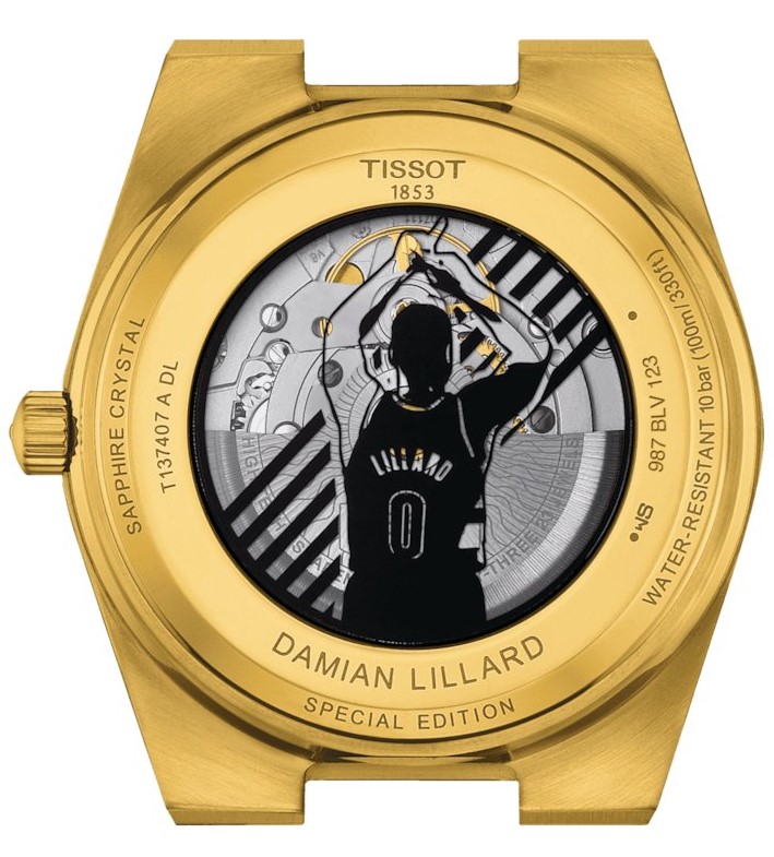 Tissot PRX Powermatic 80 Damian Lillard Special Edition T137.407.33.051.00 sú pánske automatické hodinky na integrovanom oceľovom náramku s PVD úpravou zlatej farby s motýlikovou sponou. Jedná sa o špeciálnu edíciu venovanú americkému profesionálnemu basketbalistovi Damianu Lillardovi, jednému z hlavných hviezd tímu NBA Milwaukee Bucks. Puzdro z nerezovej ocele s PVD úpravou zlatej farby má priemer 40 milimetrov a priehľadné viečko so siluetou Damiana oslavujúceho „Dame Time“. Tieto dve slová nájdeme vyryté na vnútornej lunete spolu so skratkou „DDKK“, ktorá je poctou jeho rodine a vľavo dole „YKWTII“, čo je skratka pre „You Know What Time It Is“, ktorá predchádza ikonickým okamihom „Dame Time“. Čierny číselník s dátumovkou a vzorom tvoreným z núl odkazujúcim na Damianovo číslo dresu je chránený odolným zafírovým sklom s antireflexnou vrstvou. Sekundovú ručičku zdobí Damianov monogram. Aplikované hodinové indexy sú rovnako ako ručičky pokryté luminiscenčným náterom Super-LumiNova®, ktorý garantuje perfektnú čitateľnosť za zhoršených svetelných podmienok. Pohon hodiniek zaisťuje mechanický strojček Powermatic 80 s automatickým náťahom a rezervou chodu približne 80 hodín. Vďaka použitiu antimagnetického vlásku zotrvačky Nivachron™ z titánovej zliatiny, na ktorého vývoji sa spolu so Swatch Group podieľala manufaktúra Audemars Piguet, je tento kaliber vysoko odolný voči vplyvom magnetického poľa. Tento strojček s funkciou hackingu možno v prípade potreby naťahovať aj ručne pomocou signovanej korunky. Vodotesnosť hodiniek je 10 ATM a sú vhodné na kúpanie alebo šnorchlovanie.