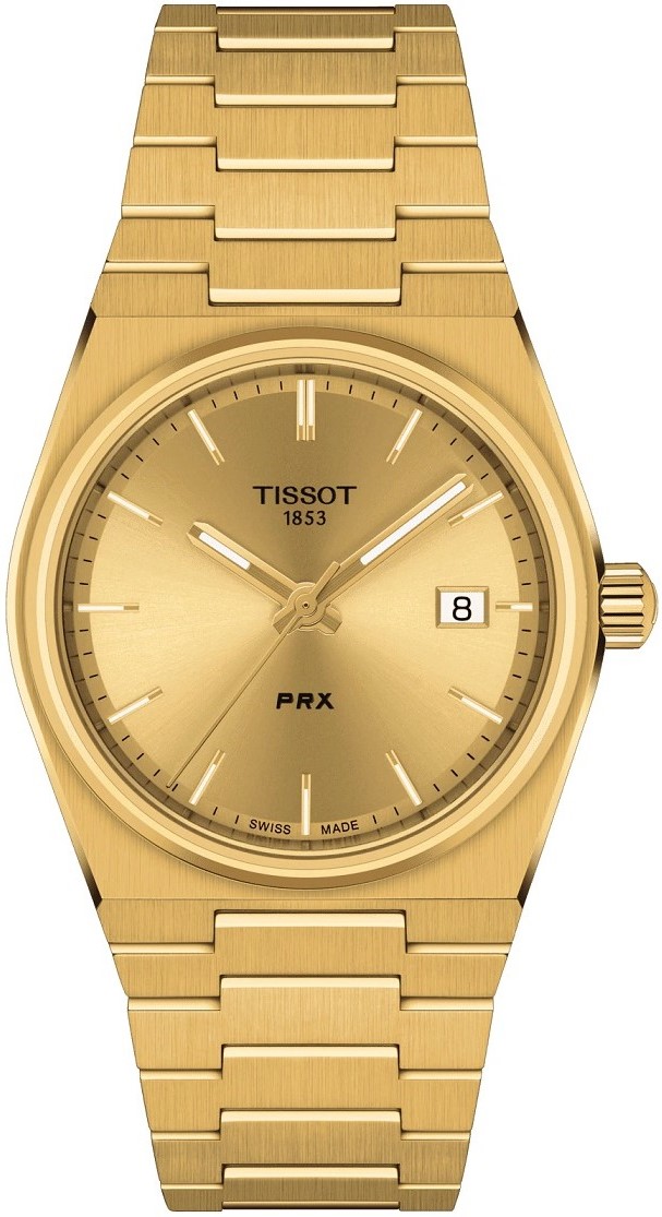 Tissot PRX Quartz T137.210.33.021.00 sú unisex batériové hodinky na integrovanom oceľovom náramku s brúsenou povrchovou PVD úpravou zlatej farby a motýlikovou sponou. Puzdro z nerezovej ocele v rovnakej farbe má priemer 35 milimetrov. Číselník v zlatej farbe s efektom slnečného brusu a indikáciou dátumu je chránený odolným zafírovým sklom. Aplikované hodinové indexy a ručičky sú pokryté luminiscenčným náterom Super-LumiNova®, ktorý garantuje perfektnú čitateľnosť za zhoršených svetelných podmienok. Pohon hodiniek zaisťuje švajčiarsky quartzový strojček ETA F06.115 s indikáciou slabej batérie EOL (End of Life) a s technológiou HeavyDrive, ktorá eliminuje vplyvy silných nárazov na chod strojčeka. Vodotesnosť hodiniek je 10 ATM a sú vhodné na kúpanie alebo šnorchlovanie.