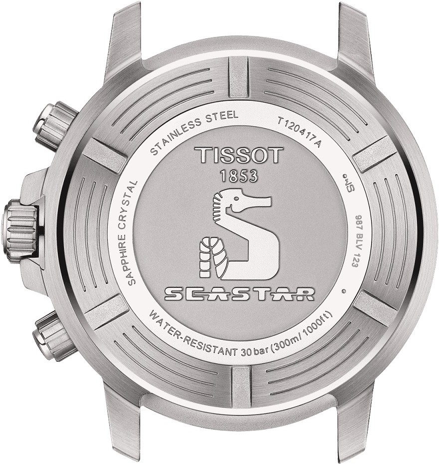 Tissot Seastar 1000 Chronograph T120.417.11.041.03 sú pánske športové batériové hodinky na oceľovom náramku s preklápacou sponou. Puzdro z nerezovej ocele má priemer 45,5 milimetra, jednosmerne otočnú lunetu s minútovou stupnicou a skrutkovaciu korunku. Modrý číselník s efektom slnečného brusu, funkciou stopiek a ukazovateľom dátumu je chránený odolným zafírovým sklom s antireflexnou vrstvou. Ručičky a indexy sú spolu s bodom na lunete pokryté luminiscenčným náterom Super-LumiNova®, ktorý garantuje perfektnú čitateľnosť za zhoršených svetelných podmienok. Pohon hodiniek zaisťuje quartzový strojček G10.212 s indikáciou slabej batérie EOL (End of Life). S vodotesnosťou 30 ATM sú hodinky vhodné na prístrojové potápanie.