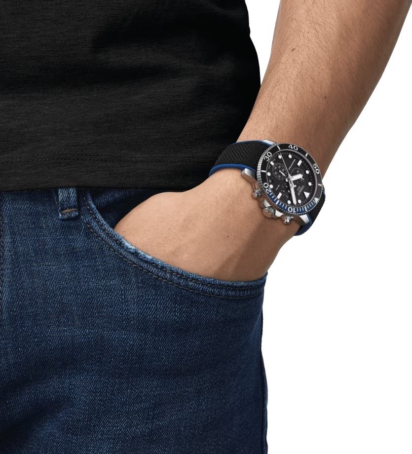Tissot Seastar 1000 Chronograph T120.417.17.051.03 sú pánske športové batériové hodinky na čierno-modrom remienku v kombinácii gumy a textilu s tŕňovou sponou. Puzdro z nerezovej ocele má priemer 45,5 milimetra, jednosmerne otočnú lunetu s minútovou stupnicou a skrutkovaciu korunku. Prehľadný čierny číselník s funkciou stopiek a ukazovateľom dátumu je chránený odolným zafírovým sklom s antireflexnou vrstvou. Ručičky a indexy sú spolu s bodom na lunete pokryté luminiscenčným náterom Super-LumiNova®, ktorý garantuje perfektnú čitateľnosť za zhoršených svetelných podmienok. Pohon hodiniek zaisťuje quartzový strojček G10.212 s indikáciou slabej batérie EOL (End of Life). S vodotesnosťou 30 ATM sú hodinky vhodné na prístrojové potápanie.