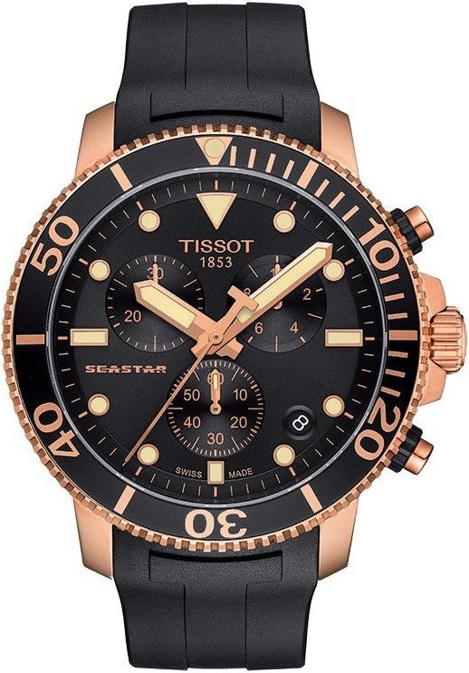 Tissot Seastar 1000 Chronograph T120.417.37.051.00 sú pánske športové batériové hodinky na čiernom kaučukovom remienku s tŕňovou sponou. Puzdro z nerezovej ocele s povrchovou PVD úpravou vo farbe ružového zlata má priemer 45,5 milimetra, jednosmerne otočnú lunetu s minútovou stupnicou a skrutkovaciu korunku. Čierny číselník s funkciou stopiek a ukazovateľom dátumu je chránený odolným zafírovým sklom s antireflexnou vrstvou. Ručičky a indexy sú spolu s bodom na lunete pokryté luminiscenčným náterom Super-LumiNova®, ktorý garantuje perfektnú čitateľnosť za zhoršených svetelných podmienok. Pohon hodiniek zaisťuje quartzový strojček G10.212 s indikáciou slabej batérie EOL (End of Life). S vodotesnosťou 30 ATM sú hodinky vhodné na prístrojové potápanie.