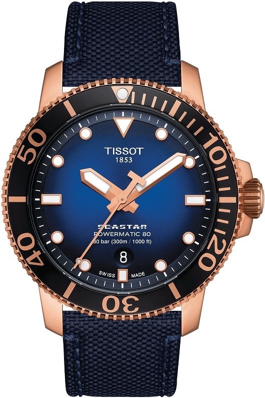 Tissot Seastar 1000 Powermatic 80 T120.407.37.041.00 sú pánske automatické športové hodinky na tmavo modrom textilnom remienku s motýlikovou sponou. Puzdro z nerezovej ocele s povrchovou PVD úpravou vo farbe ružového zlata má priemer 43 milimetrov, priehľadné viečko, jednosmerne otočnú lunetu s keramickou vložkou s minútovou stupnicou a skrutkovaciu korunku. Modrý gradientný číselník s ukazovateľom dátumu na šiestej hodine je chránený odolným zafírovým sklom s antireflexnou vrstvou. Ručičky a indexy sú spolu s bodom na lunete pokryté luminiscenčným náterom Super-LumiNova®, ktorý garantuje perfektnú čitateľnosť za zhoršených svetelných podmienok. Pohon hodiniek zaisťuje mechanický strojček Powermatic 80.111 s automatickým náťahom a rezervou chodu 80 hodín. S vodotesnosťou 30 ATM sú hodinky vhodné na prístrojové potápanie.