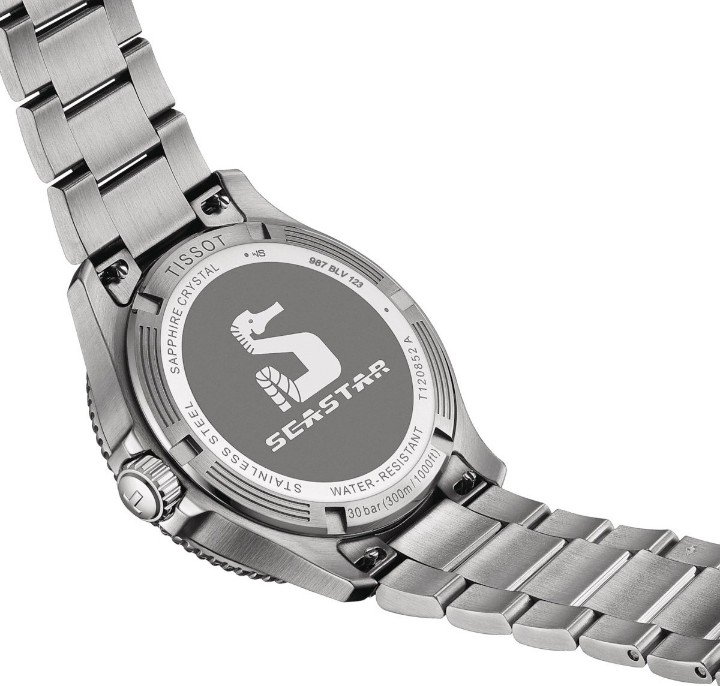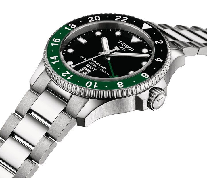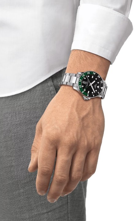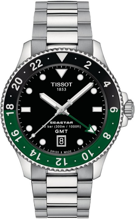 Tissot Seastar 1000 Quartz GMT T120.852.11.051.00 sú pánske batériové hodinky v klasickom štýle na oceľovom náramku s preklápacou sponou. Puzdro z nerezovej ocele má priemer 40 milimetrov, jednosmerne otočnú GMT lunetu a skrutkovaciu korunku. Prehľadný čierny číselník so zelenou GMT rúčkou a ukazovateľom dátumu na šiestej hodine je chránený odolným zafírovým sklom. Aplikované hodinové indexy sú rovnako ako rúčky pokryté luminiscenčným náterom Super-LumiNova®, ktorý garantuje perfektnú čitateľnosť za zhoršených svetelných podmienok. Pohon hodiniek zaisťuje quartzový strojček s indikáciou slabej batérie EOL (End of Life). S vodotesnosťou 30 ATM sú hodinky vhodné na prístrojové potápanie.
