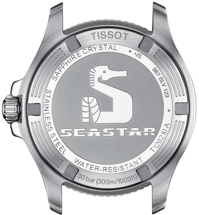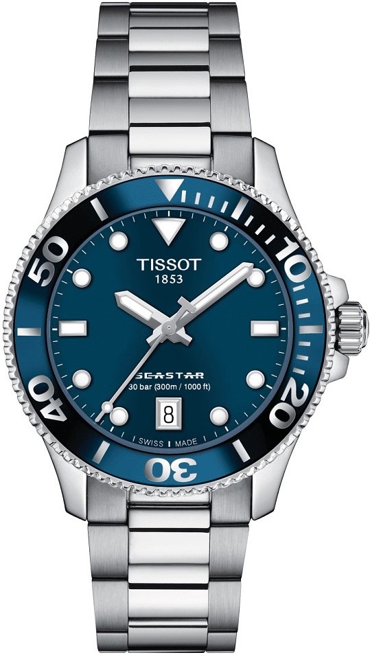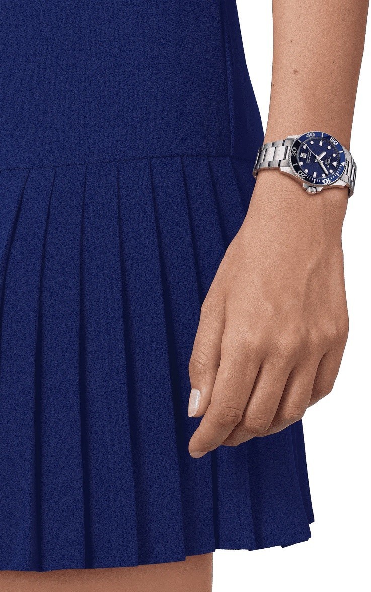 Tissot Seastar 1000 Quartz T120.210.11.041.00 sú dámske batériové hodinky v klasickom štýle na oceľovom náramku s preklápacou sponou. Puzdro z nerezovej ocele má priemer 36 milimetrov a skrutkovaciu korunku. Prehľadný modrý číselník s efektom slnečného brusu a ukazovateľom dátumu na šiestej hodine je chránený odolným zafírovým sklom s antireflexnou vrstvou. Aplikované hodinové indexy sú rovnako ako ručičky pokryté luminiscenčným náterom Super-LumiNova®, ktorý garantuje perfektnú čitateľnosť za zhoršených svetelných podmienok. Pohon hodiniek zaisťuje quartzový strojček F05.412 s indikáciou slabej batérie EOL (End of Life). S vodotesnosťou 30 ATM sú hodinky vhodné na prístrojové potápanie.