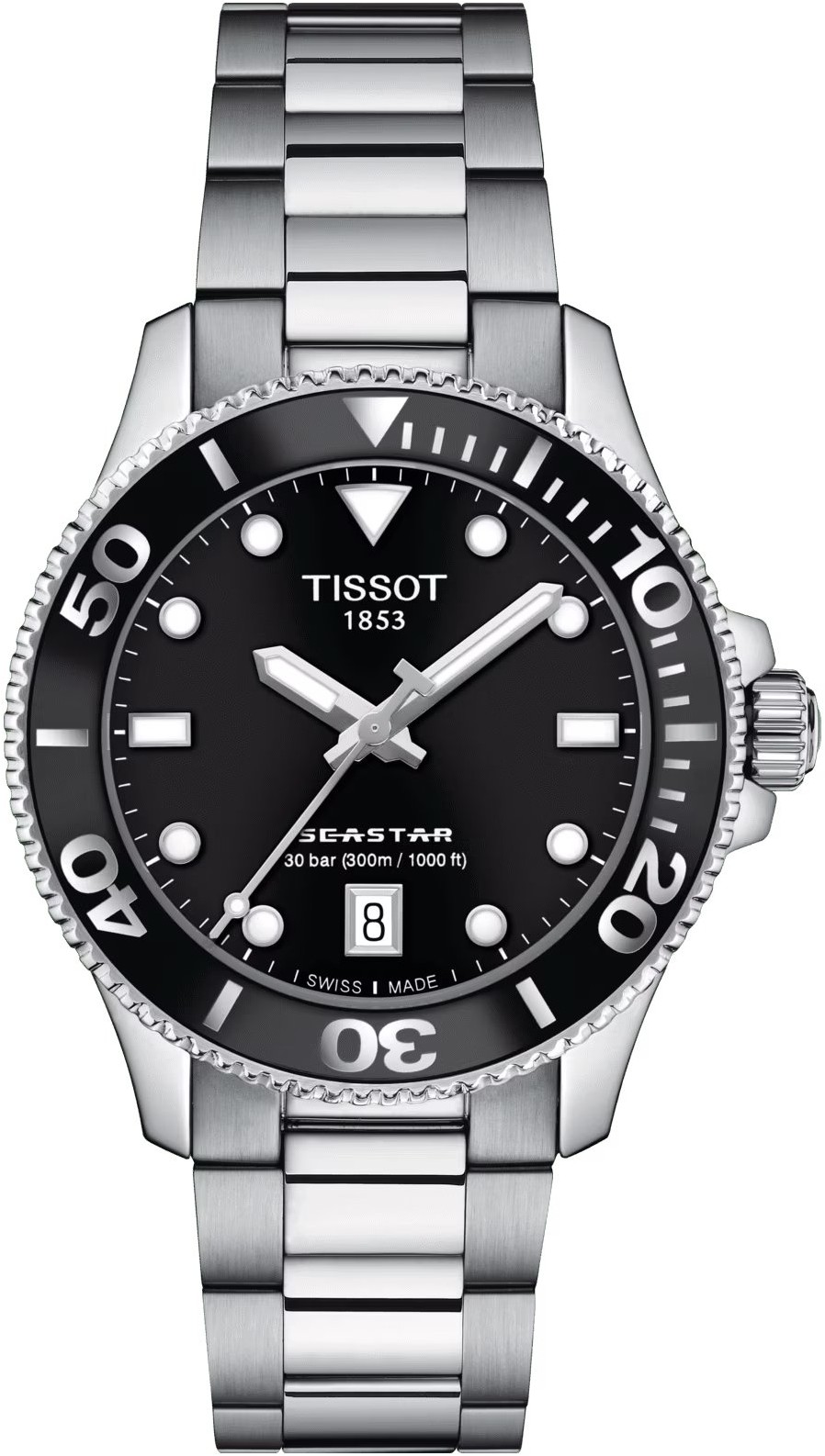 Tissot Seastar 1000 Quartz T120.210.11.051.00 sú dámske batériové hodinky v klasickom štýle na oceľovom náramku s preklápacou sponou. Puzdro z nerezovej ocele má priemer 36 milimetrov a skrutkovaciu korunku. Prehľadný čierny číselník s ukazovateľom dátumu na šiestej hodine je chránený odolným zafírovým sklom s antireflexnou vrstvou. Aplikované hodinové indexy sú rovnako ako rúčky pokryté luminiscenčným náterom Super-LumiNova®, ktorý garantuje perfektnú čitateľnosť za zhoršených svetelných podmienok. Pohon hodiniek zaisťuje quartzový strojček F05.412 s indikáciou slabej batérie EOL (End of Life). S vodotesnosťou 30 ATM sú hodinky vhodné na prístrojové potápanie.