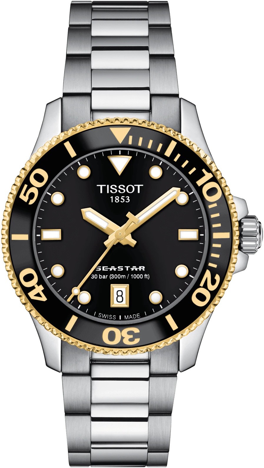Tissot Seastar 1000 Quartz T120.210.21.051.00 sú dámske batériové hodinky v klasickom štýle na oceľovom náramku s preklápacou sponou. Puzdro z nerezovej ocele má priemer 36 milimetrov, lunetu opatrenú PVD úpravou zlatej farby a skrutkovaciu korunku. Prehľadný čierny číselník s ukazovateľom dátumu na šiestej hodine je chránený odolným zafírovým sklom s antireflexnou vrstvou. Aplikované hodinové indexy sú rovnako ako ručičky pokryté luminiscenčným náterom Super-LumiNova®, ktorý garantuje perfektnú čitateľnosť za zhoršených svetelných podmienok. Pohon hodiniek zaisťuje quartzový strojček F05.412 s indikáciou slabej batérie EOL (End of Life). S vodotesnosťou 30 ATM sú hodinky vhodné na prístrojové potápanie.