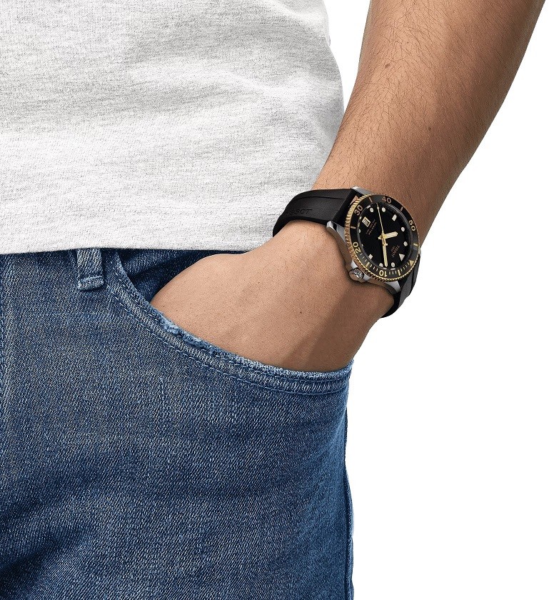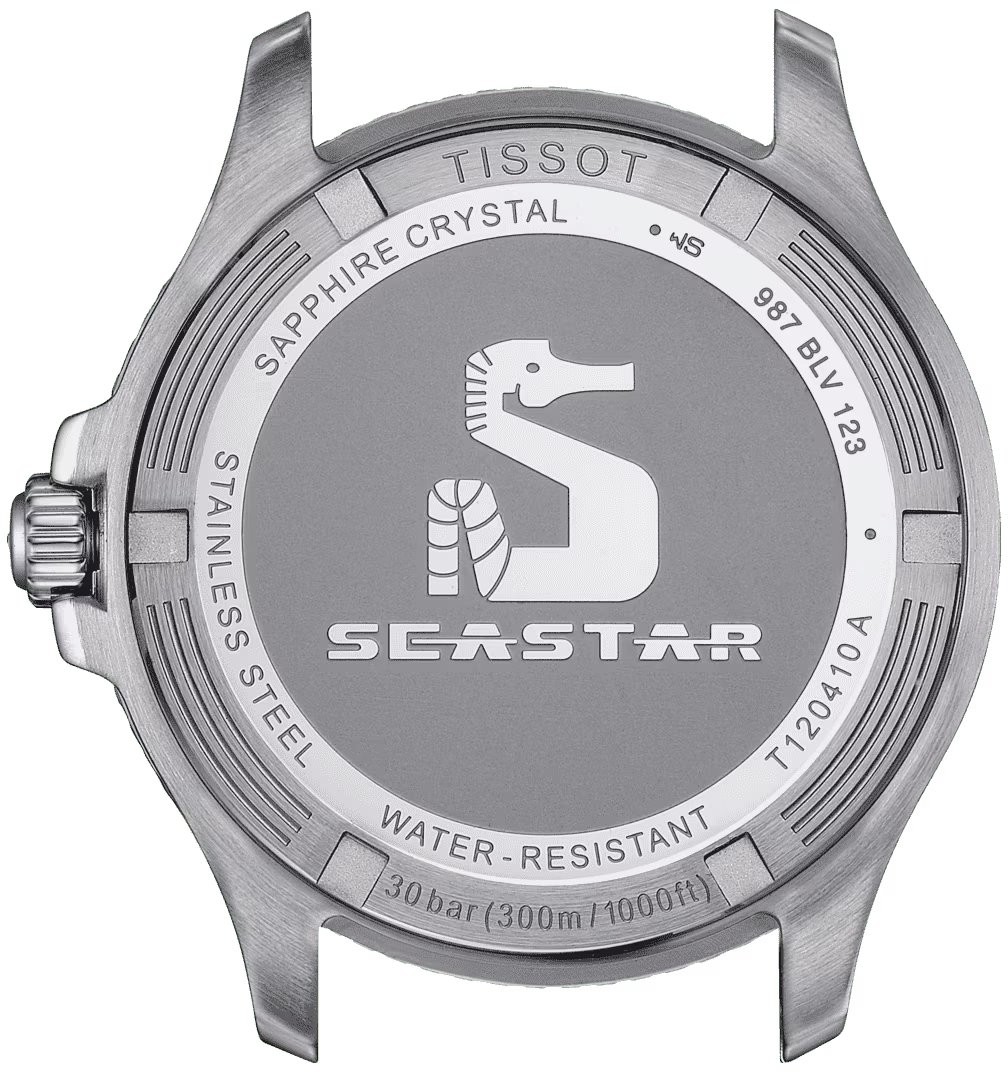 Tissot Seastar 1000 Quartz T120.410.27.051.00 sú pánske batériové športové hodinky na čiernom kaučukovom remienku s tŕňovou sponou. Puzdro z nerezovej ocele má priemer 40 milimetrov, lunetu opatrenú PVD úpravou v zlatej farbe a skrutkovaciu korunku. Prehľadný čierny číselník s ukazovateľom dátumu na šiestej hodine je chránený odolným zafírovým sklom s antireflexnou vrstvou. Aplikované hodinové indexy sú rovnako ako ručičky pokryté luminiscenčným náterom Super-LumiNova®, ktorý garantuje perfektnú čitateľnosť za zhoršených svetelných podmienok. Pohon hodiniek zaisťuje quartzový strojček F06.412 s indikáciou slabej batérie EOL (End of Life). S vodotesnosťou 30 ATM sú hodinky vhodné na prístrojové potápanie.