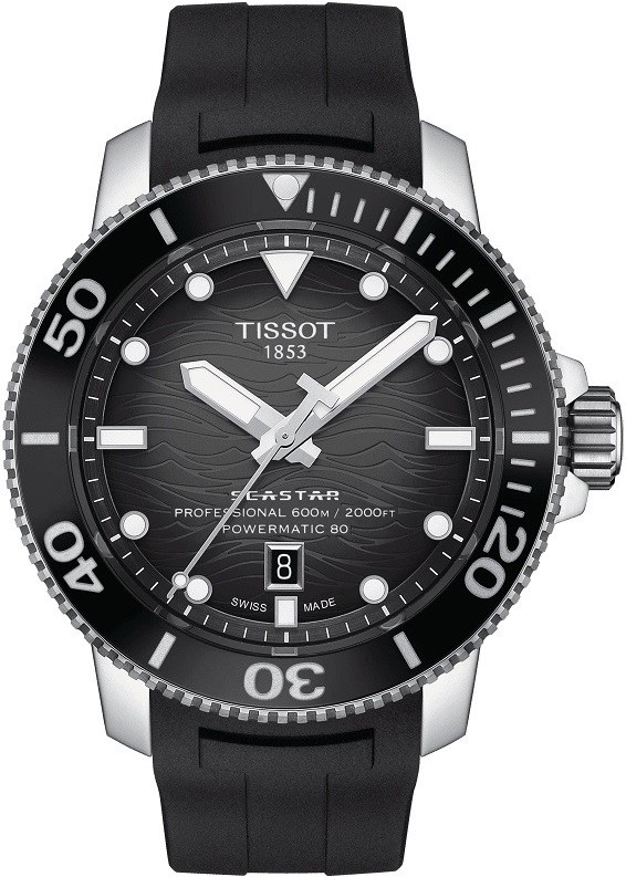 Tissot Seastar 2000 Professional Powermatic 80 T120.607.17.441.00 sú pánske športové potápačské automatické hodinky na čiernom kaučukovom remienku s tŕňovou sponou. Puzdro z nerezovej ocele má priemer 46 milimetrov, priehľadné viečko, jednosmerne otočnú lunetu s keramickou vložkou s minútovou stupnicou, héliový ventil a skrutkovaciu korunku. Antracitový gradientný číselník s textúrou vĺn a ukazovateľom dátumu na šiestej hodine je chránený odolným zafírovým sklom s antireflexnou vrstvou. Ručičky a indexy sú spolu s bodom na lunete pokryté luminiscenčným náterom Super-LumiNova®, ktorý garantuje perfektnú čitateľnosť za zhoršených svetelných podmienok. Pohon hodiniek zaisťuje mechanický strojček Powermatic 80.111 s automatickým náťahom a rezervou chodu 80 hodín. S vodotesnosťou 60 ATM sú hodinky vhodné na prístrojové potápanie.