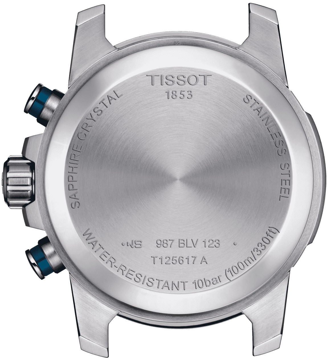 Tissot Supersport Chrono T125.617.11.041.00 sú pánske športové hodinky na oceľovom náramku s preklápacou sponou. Puzdro z nerezovej ocele má priemer 45,5 milimetra a pevnú modrú hliníkovú lunetu s tachymetrickou stupnicou. Modrý číselník s efektom slnečného brusu a striebornými subciferníkmi je chránený odolným zafírovým sklíčkom. Ručičky a aplikované indexy sú potiahnuté luminiscenčným náterom Super-LumiNova®, ktorý garantuje perfektnú čitateľnosť za zhoršených svetelných podmienok. Pohon hodiniek zaisťuje quartzový strojček ETA G10.212 s maximálnou dennou odchýlkou v presnosti chodu rádovo +/- 0,1 sekúnd. Hodinky disponujú funkciou stopiek, dátumovkou a indikáciou slabej batérie. S vodotesnosťou 10 ATM sú vhodné na kúpanie alebo šnorchlovanie.