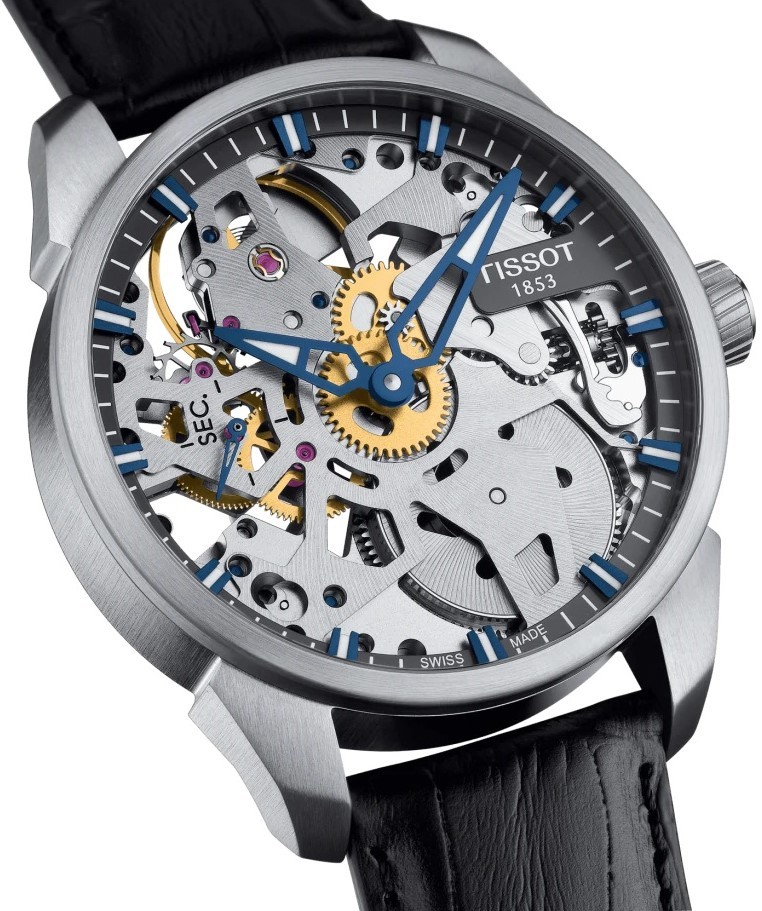 Tissot T-Complication Squelette T070.405.16.411.00 sú pánske elegantné mechanické hodinky na čiernom koženom remienku s motýlikovou sponou. Puzdro z nerezovej ocele má priemer 43 milimetrov a priehľadné viečko. Skeletónový číselník je chránený odolným zafírovým sklom s antireflexnou vrstvou. Ručičky a indexy sú potiahnuté luminiscenčným náterom Super-LumiNova®, ktorý garantuje perfektnú čitateľnosť za zhoršených svetelných podmienok. Pohon hodiniek zaisťuje mechanický strojček ETA 6497-1 s ručným náťahom a rezervou chodu 46 hodín. S vodotesnosťou 5 ATM sú hodinky odolné proti dažďu a pri sprchovaní.