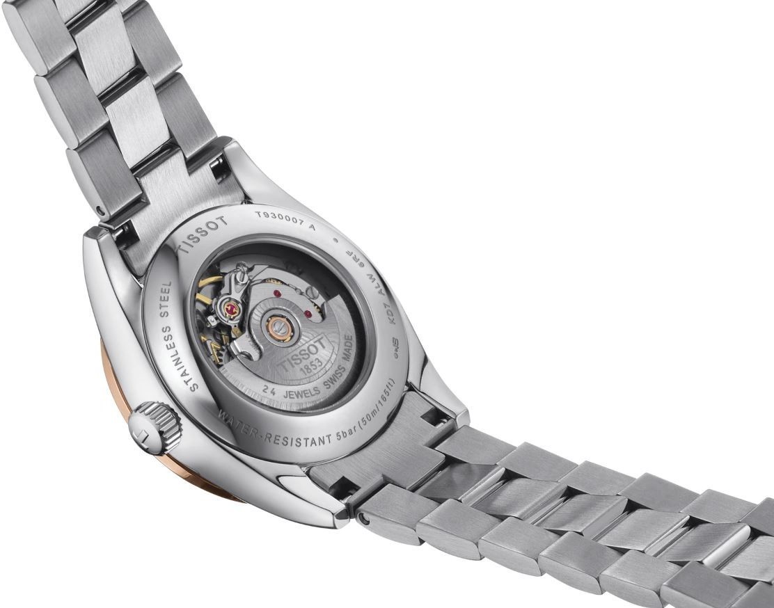 Tissot T-MY Lady Automatic 18k Gold T930.007.41.031.00 sú dámske automatické hodinky v klasickom štýle na oceľovom náramku s motýlikovou sponou. Puzdro z nerezovej ocele má priemer 29 milimetrov, priehľadné viečko a lunetu z 18 karátového ružového zlata zdobenú 60 diamantmi s hmotnosťou 0,39 ct a čistote VS-SI. Strieborný číselník s efektom slnečného brusu a ukazovateľom dátumu na tretej hodine je chránený odolným zafírovým sklom. Pohon hodiniek zaisťuje mechanický strojček Powermatic 48.111 s automatickým náťahom a rezervou chodu 48 hodín. S vodotesnosťou 5 ATM sú hodinky odolné proti dažďu a pri sprchovaní.