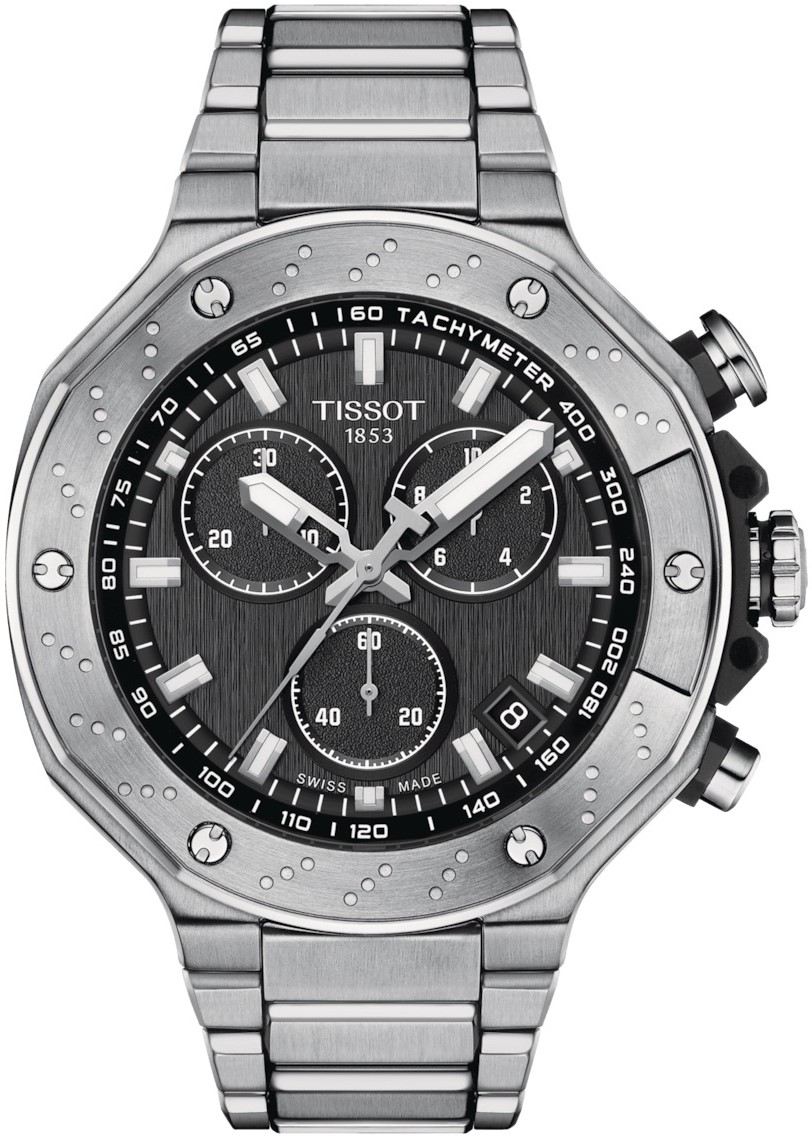 Tissot T-Race Chronograph T141.417.11.051.01 sú pánske batériové športové hodinky na oceľovom náramku s preklápacou sponou. Puzdro z nerezovej ocele má priemer 45 milimetrov a vnútornú lunetu s tachymetrickou stupnicou. Čierny štruktúrovaný číselník s indikáciou dátumu a chronografom je chránený odolným zafírovým sklom s antireflexnou vrstvou. Aplikované hodinové indexy sú rovnako ako rúčky pokryté luminiscenčným náterom Super-LumiNova®, ktorý garantuje perfektnú čitateľnosť za zhoršených svetelných podmienok. Pohon hodiniek zaisťuje quartzový strojček ETA G10.212 s presnosťou +/- 10 sekúnd za rok a indikáciou slabej batérie. Vodotesnosť hodiniek je 10 ATM a sú teda vhodné na kúpanie alebo šnorchlovanie.