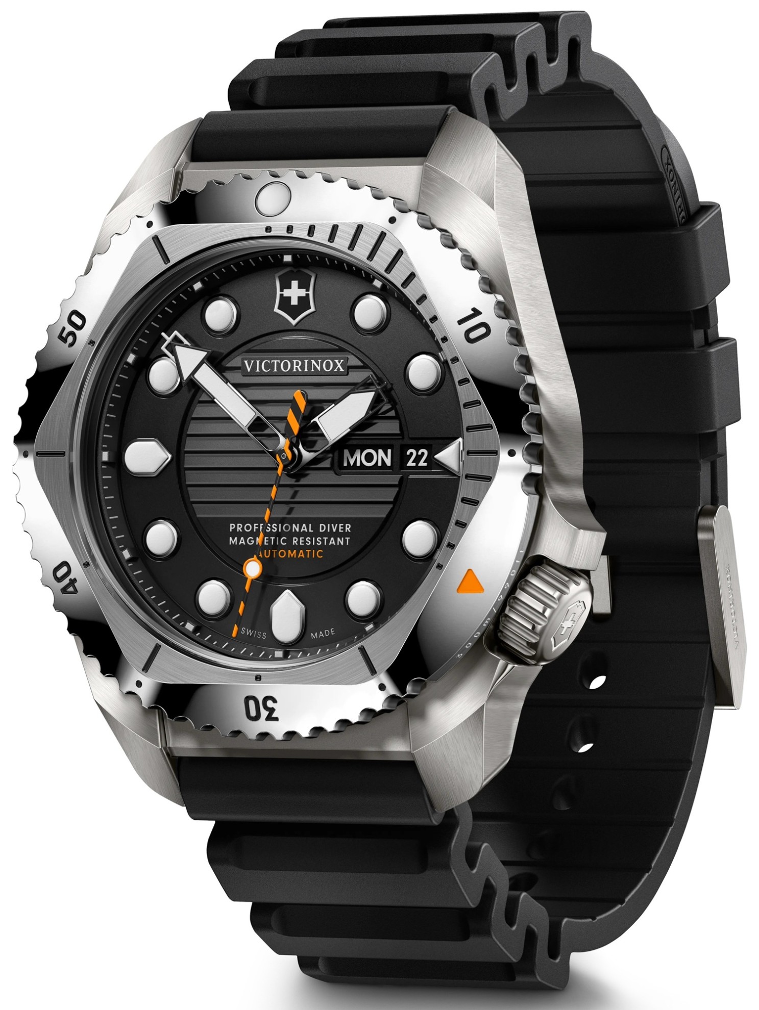 Hodinky Victorinox Dive Pro sú určené pre všetkých, ktorí hľadajú kvalitu, presnosť a dokonalosť v každodennom živote. Každé z týchto potápačských hodiniek s certifikáciou ISO 6425 sú testované na vodeodolnosť 300 metrov a odolávajú piesku, nečistotám, nárazom a vibráciám. Ako vyžadujú potápačské normy, odolnosť proti nárazom a anti-magnetická ochrana zabraňujú nepresnostiam v meraní času a zaisťujú absolútnu presnosť a spoľahlivosť. Táto výnimočná odolnosť a výkonnosť je čisto výsledkom majstrovského remeselného spracovania tvorcov. Jasné línie, výrazné tvary a inovatívne kombinácie materiálov charakterizujú autentický dizajn značky.