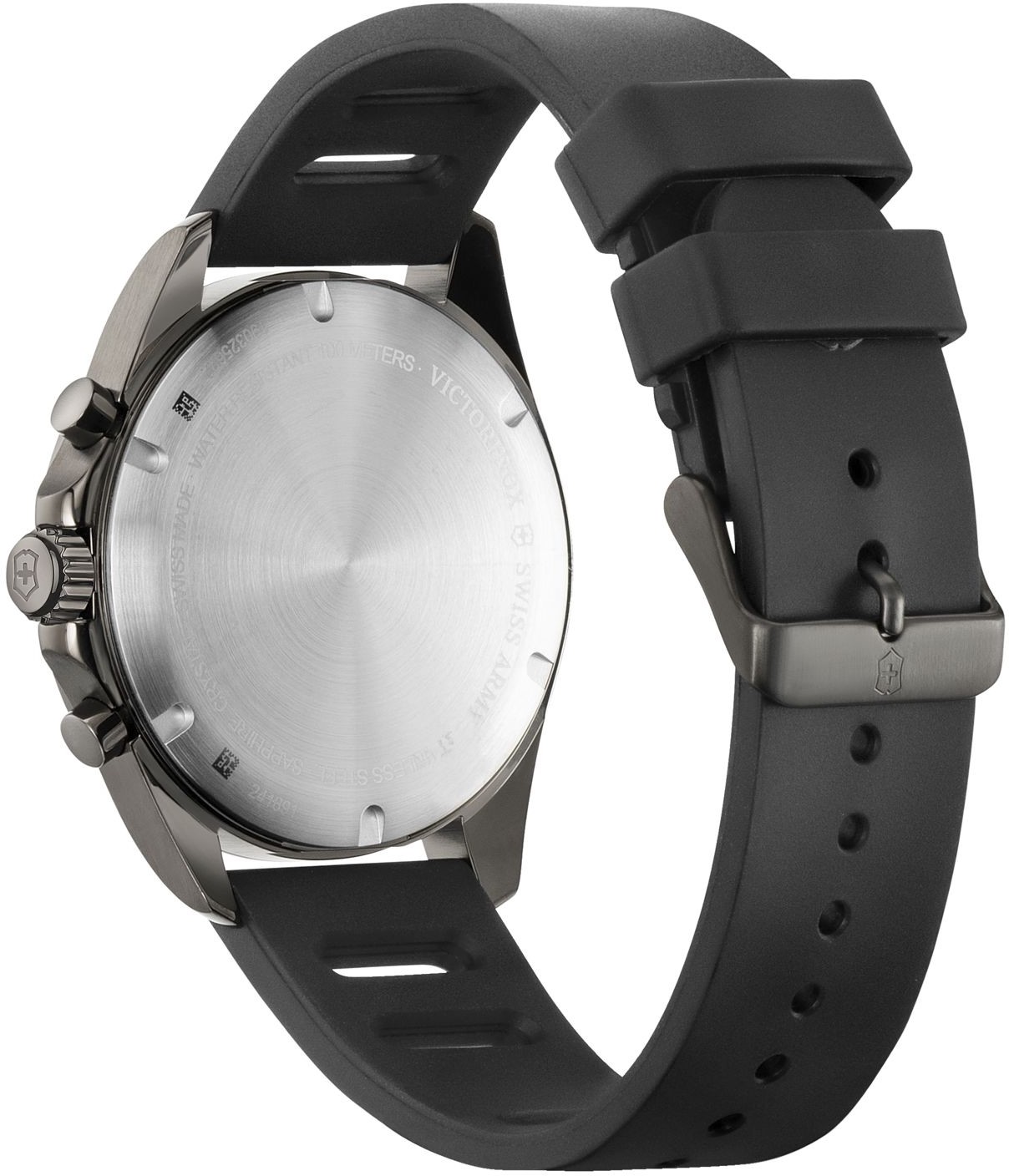 Victorinox FieldForce Chrono 241891 sú pánske športové batériové hodinky na čiernom kaučukovom remienku s tŕňovou sponou. Puzdro z nerezovej ocele s povrchovou PVD úpravou v tmavosivej farbe má priemer 42 milimetrov, čiernu lunetu s tachymetrickou stupnicou a skrutkovaciu korunku. Šedo-čierny číselník so stopkami a ukazovateľom dátumu na šiestej hodine je chránený odolným zafírovým sklom s antireflexnou vrstvou. Ručičky a indexy pokrýva luminiscenčný náter, ktorý po nasvietení garantuje perfektnú čitateľnosť za zhoršených svetelných podmienok. Pohon hodiniek zaisťuje quartzový strojček Ronda 5030.D. S vodotesnosťou 10 ATM sú hodinky vhodné na plávanie a šnorchlovanie.