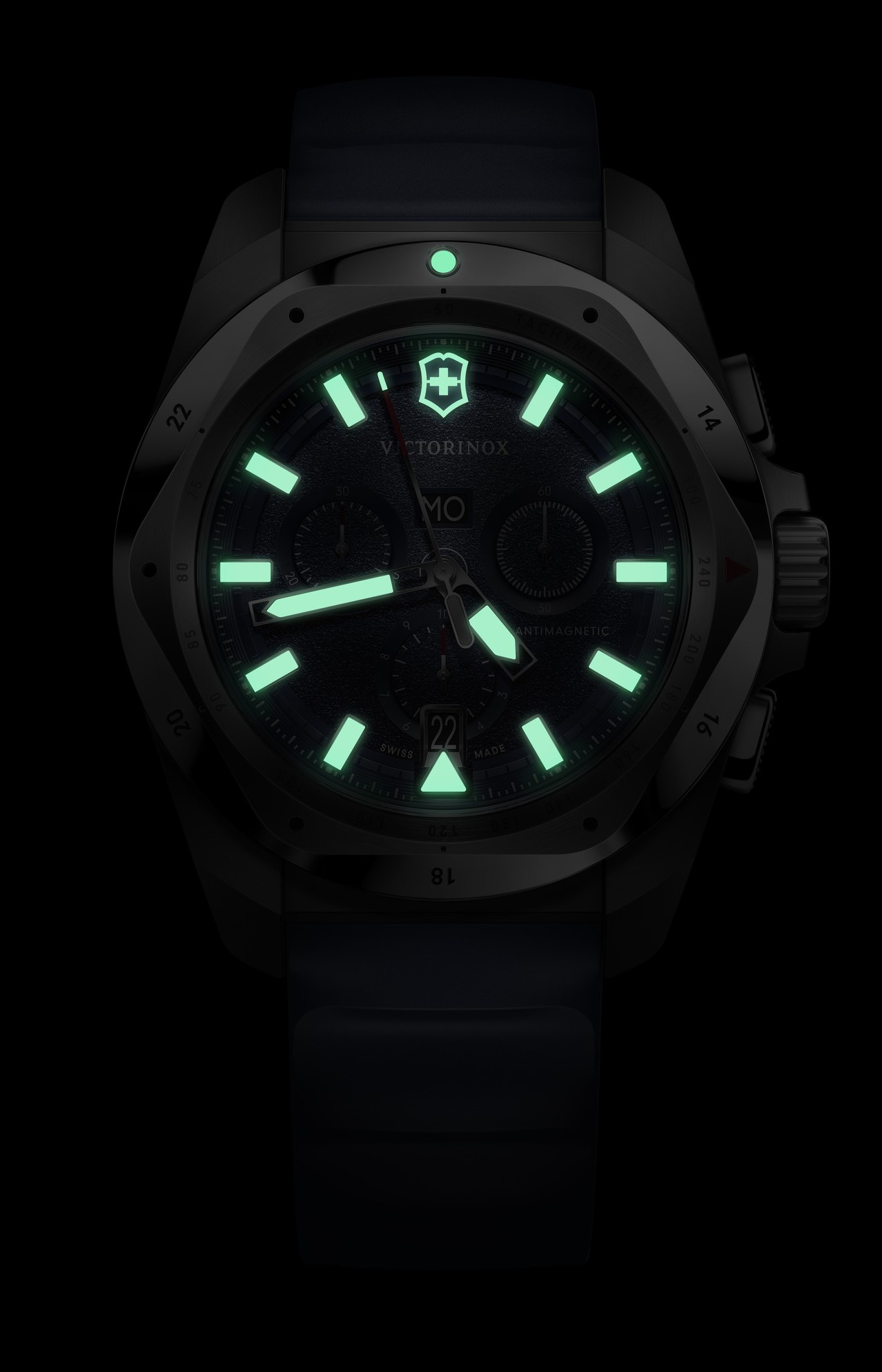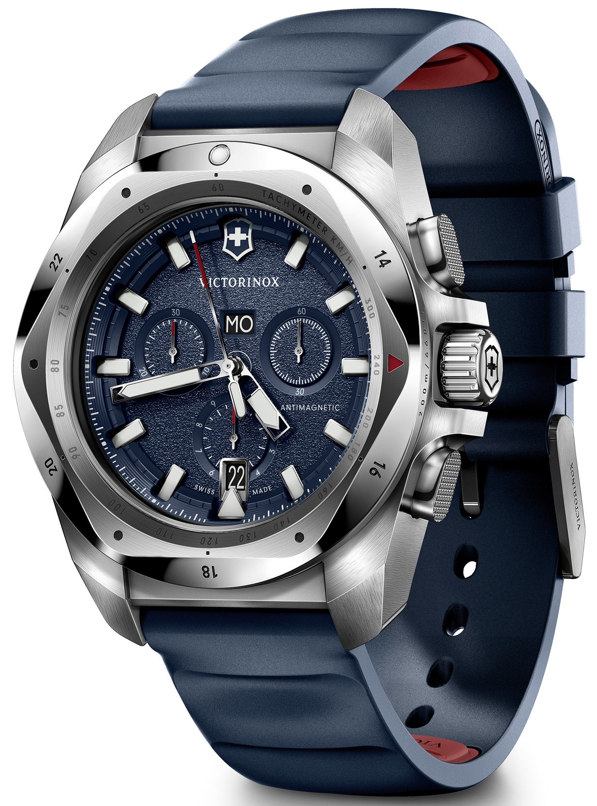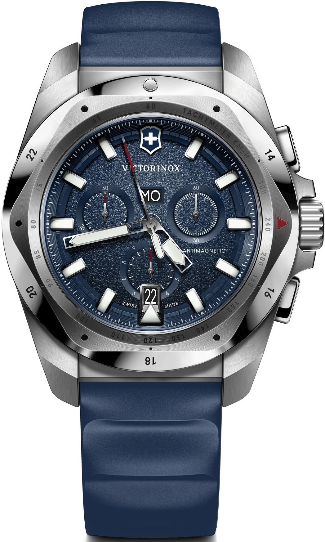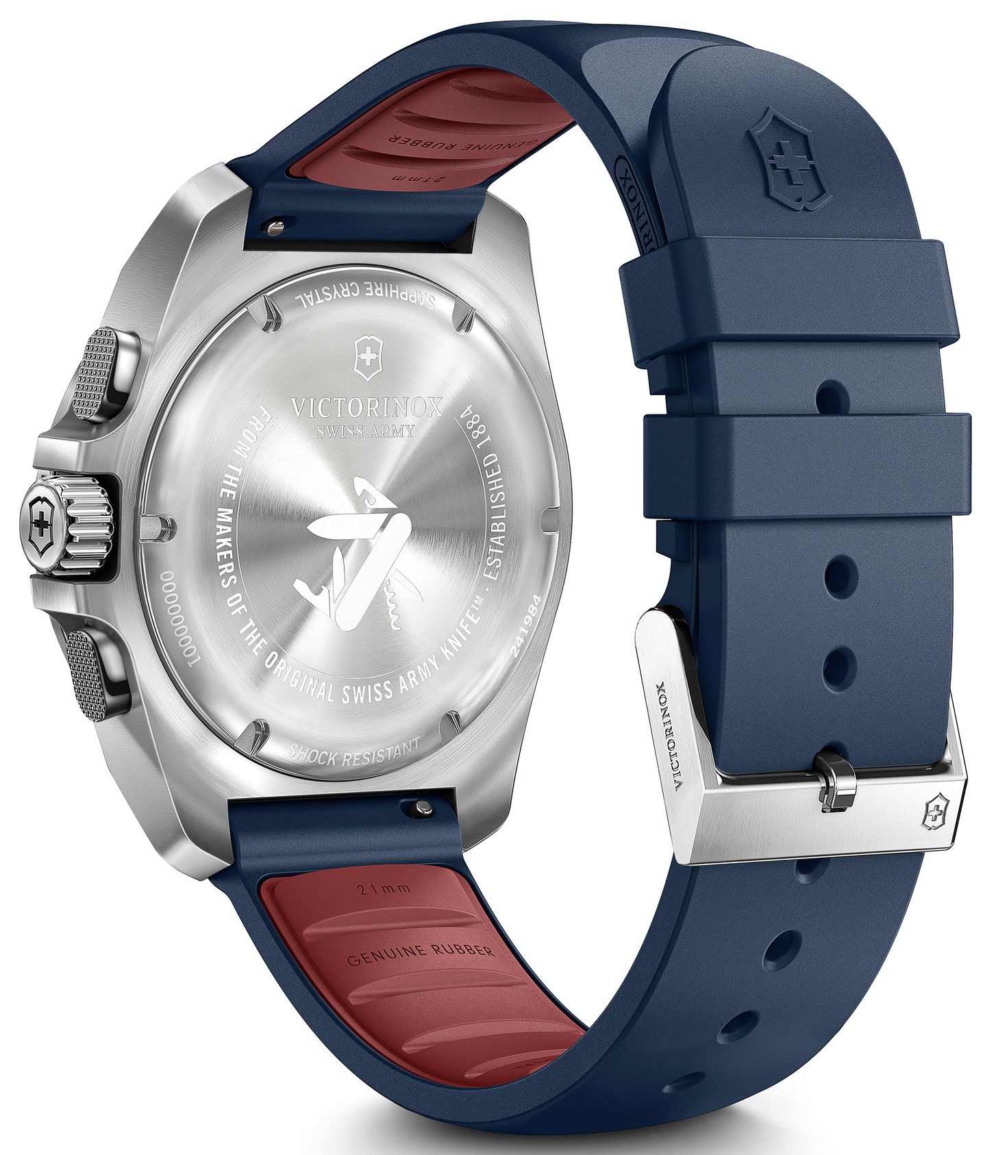 Victorinox I.N.O.X. 241984 sú pánske športové batériové hodinky na modrom kaučukovom remienku s tŕňovou sponou. Puzdro z nerezovej ocele má priemer 43 milimetrov, lunetu s tachymetrickou stupnicou a skrutkovaciu korunku. Modrý textúrovaný číselník so stopkami a indikáciou dátumu a dňa v týždni je chránený odolným zafírovým sklom s antireflexnou vrstvou. Ručičky, indexy a bod na lunete majú luminiscenčný náter Super-LumiNova®, ktorý po nasvietení garantuje perfektnú čitateľnosť za zhoršených svetelných podmienok. Pohon hodiniek zaisťuje švajčiarsky quartzový strojček Ronda 5040.E. S vodotesnosťou 20 ATM sú hodinky vhodné pre hlbinné potápanie.