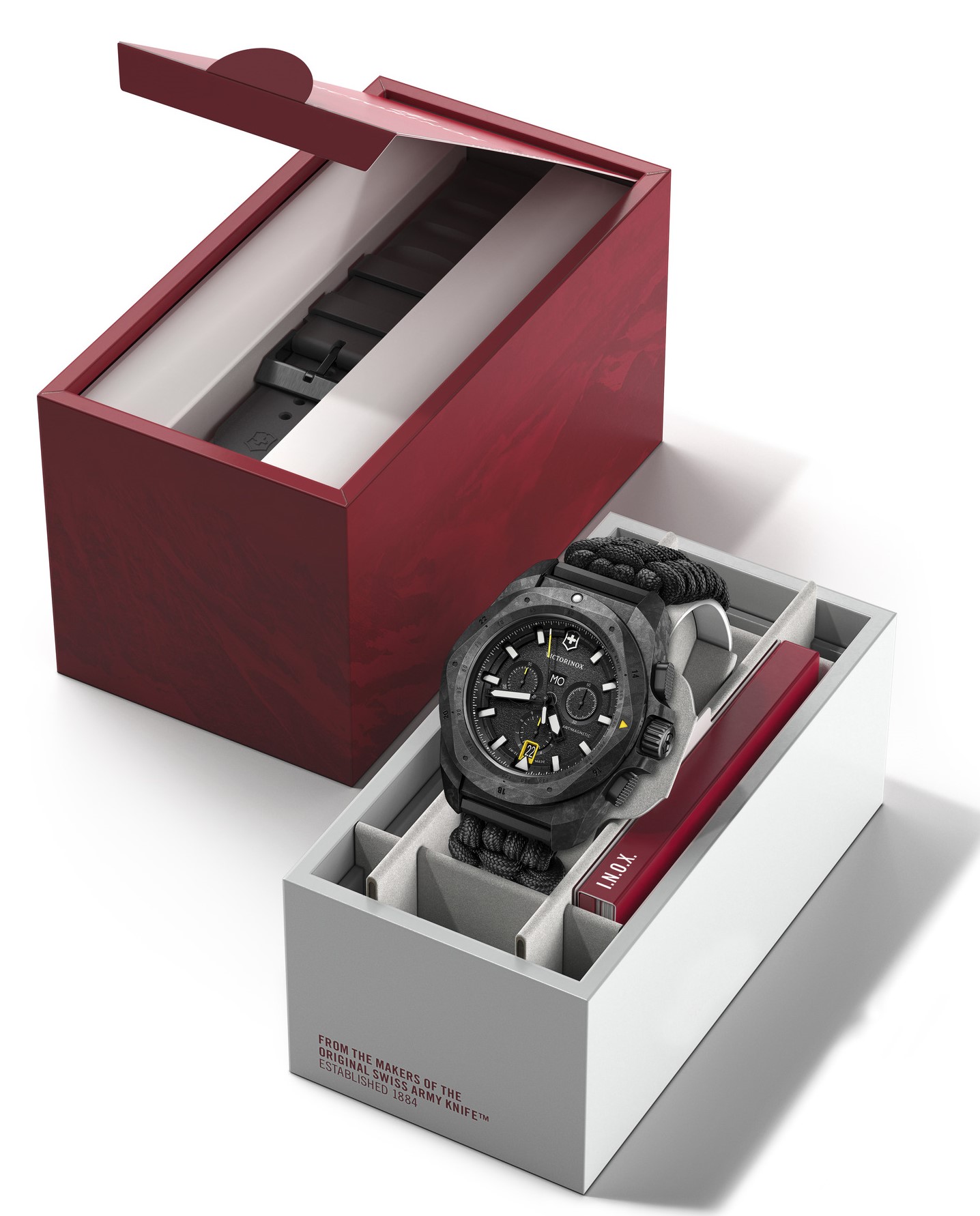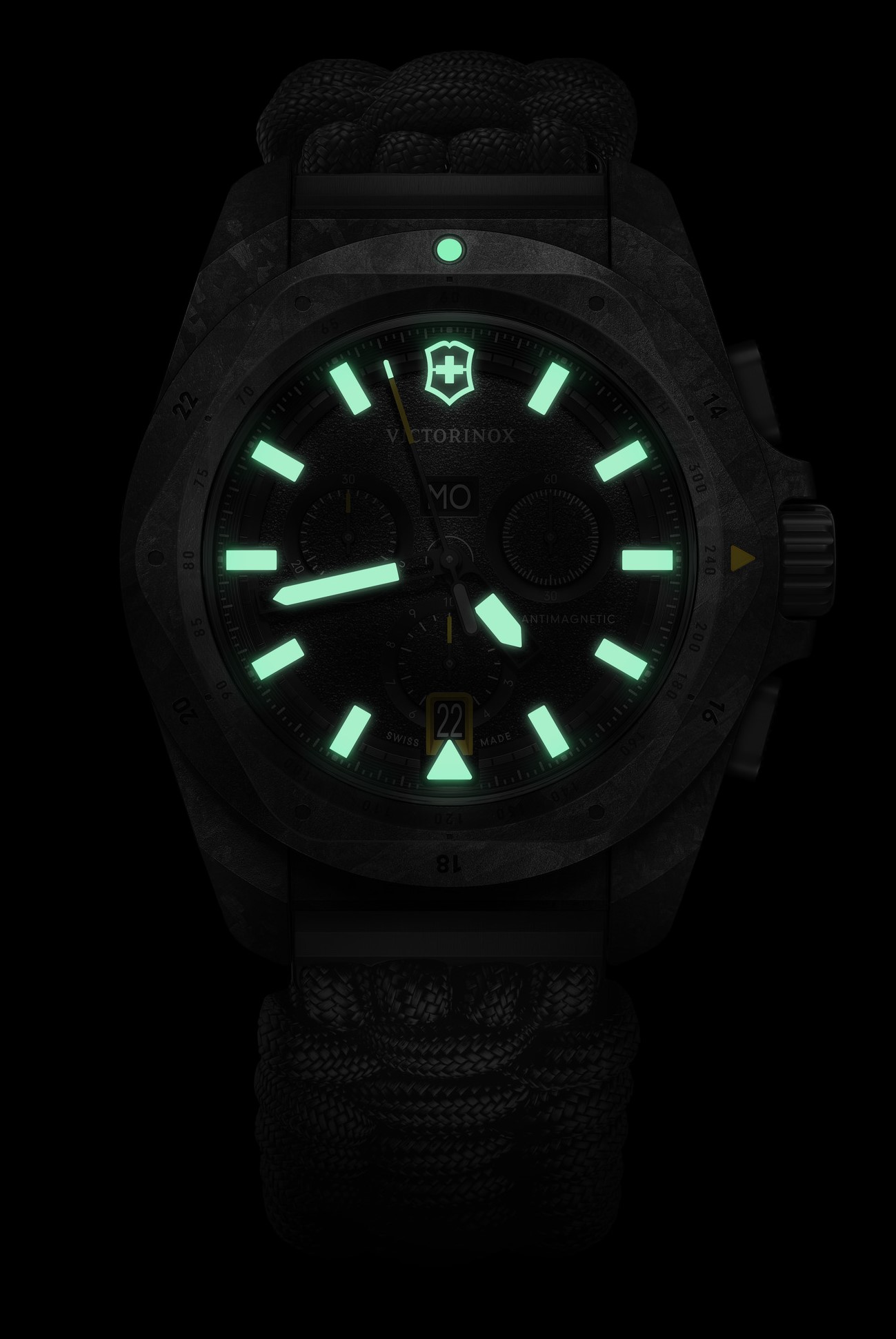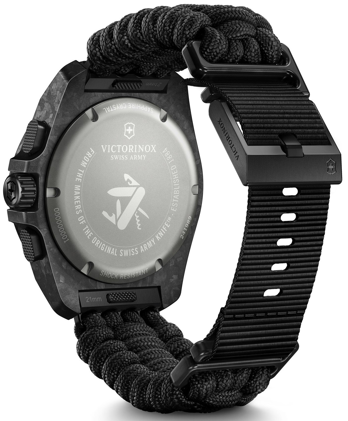 Victorinox I.N.O.X. 241989.1 sú pánske športové batériové hodinky na čiernom textilnom remienku s tŕňovou sponou. Karbónové púzdro má priemer 43 milimetrov, lunetu s tachymetrickou stupnicou a skrutkovaciu korunku. Čierny textúrovaný číselník so stopkami a indikáciou dátumu a dňa v týždni je chránený odolným zafírovým sklom s antireflexnou vrstvou. Ručičky, indexy a bod na lunete majú luminiscenčný náter Super-LumiNova®, ktorý po nasvietení garantuje perfektnú čitateľnosť za zhoršených svetelných podmienok. Pohon hodiniek zaisťuje švajčiarsky quartzový strojček Ronda 5040.E. S vodotesnosťou 20 ATM sú hodinky vhodné na hlbinné potápanie. Súčasťou balenia je náhradný kaučukový remienok čiernej farby.