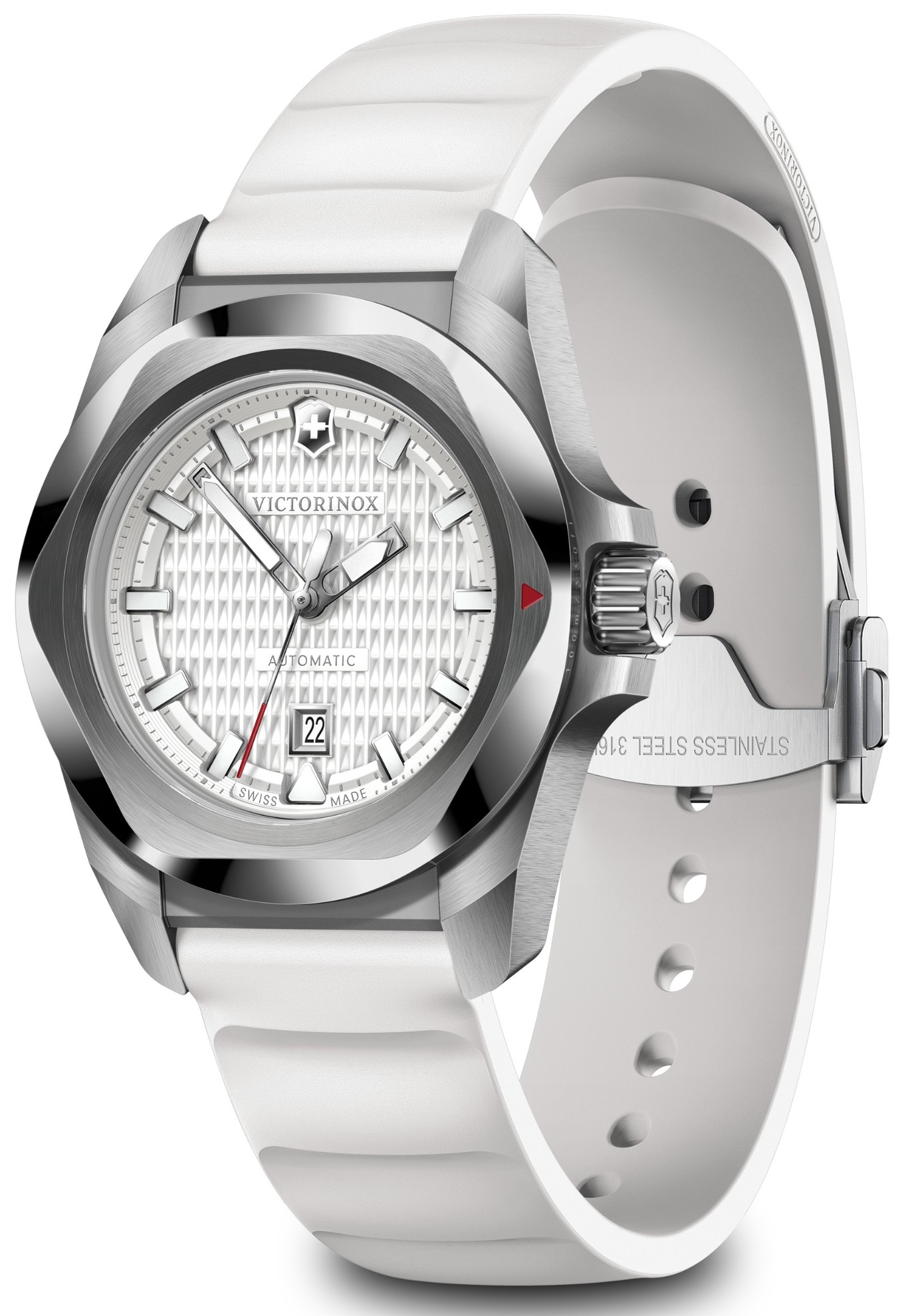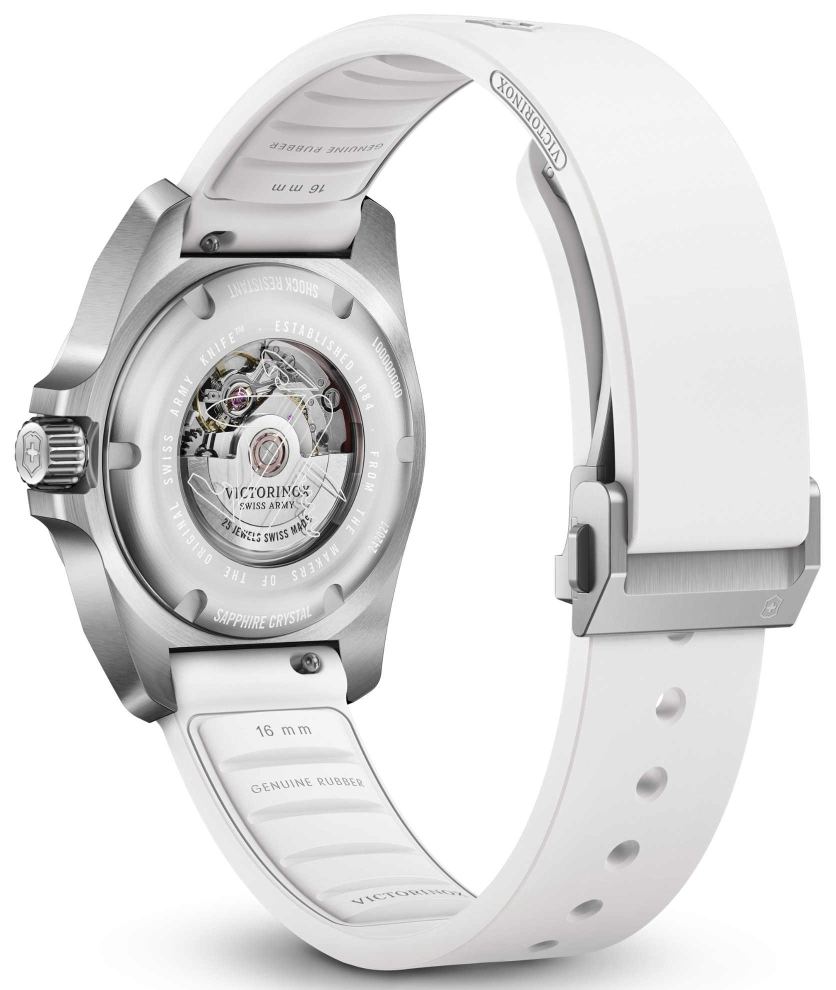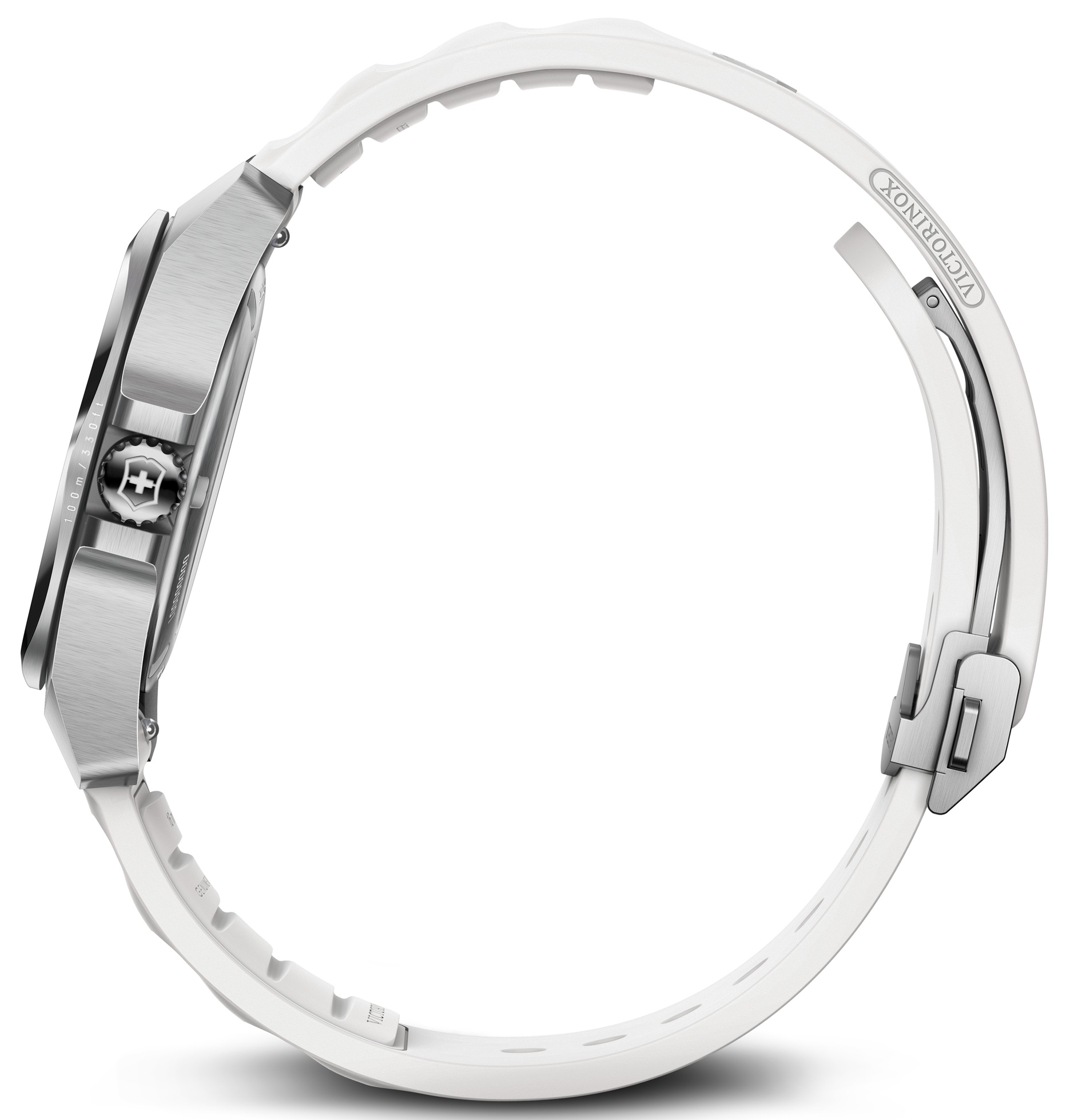 Victorinox I.N.O.X. 242027 sú dámske športové automatické hodinky na bielom kaučukovom remienku s preklápacou sponou. Puzdro z nerezovej ocele má priemer 32 milimetrov a priehľadné viečko. Biely texturovaný číselník s ukazovateľom dátumu na šiestej hodine je chránený odolným zafírovým sklom s antireflexnou vrstvou. Ručičky a indexy pokrýva luminiscenčný náter Super-LumiNova®, ktorý po nasvietení garantuje perfektnú čitateľnosť za zhoršených svetelných podmienok. Pohon hodiniek zaisťuje mechanický strojček Sellita SW100 s automatickým náťahom a rezervou chodu 42 hodín. S vodotesnosťou 10 ATM sú hodinky vhodné na plávanie a šnorchlovanie.