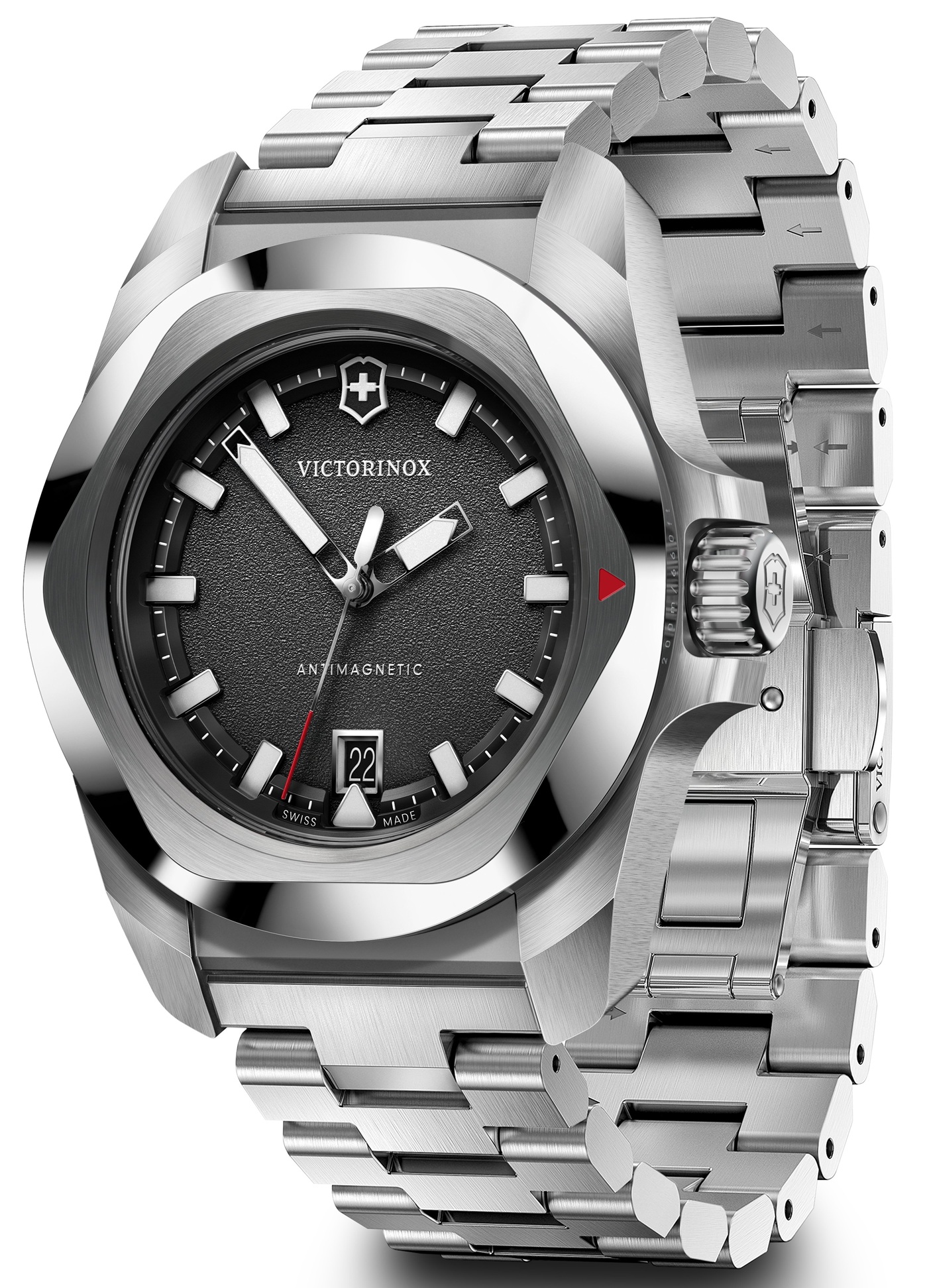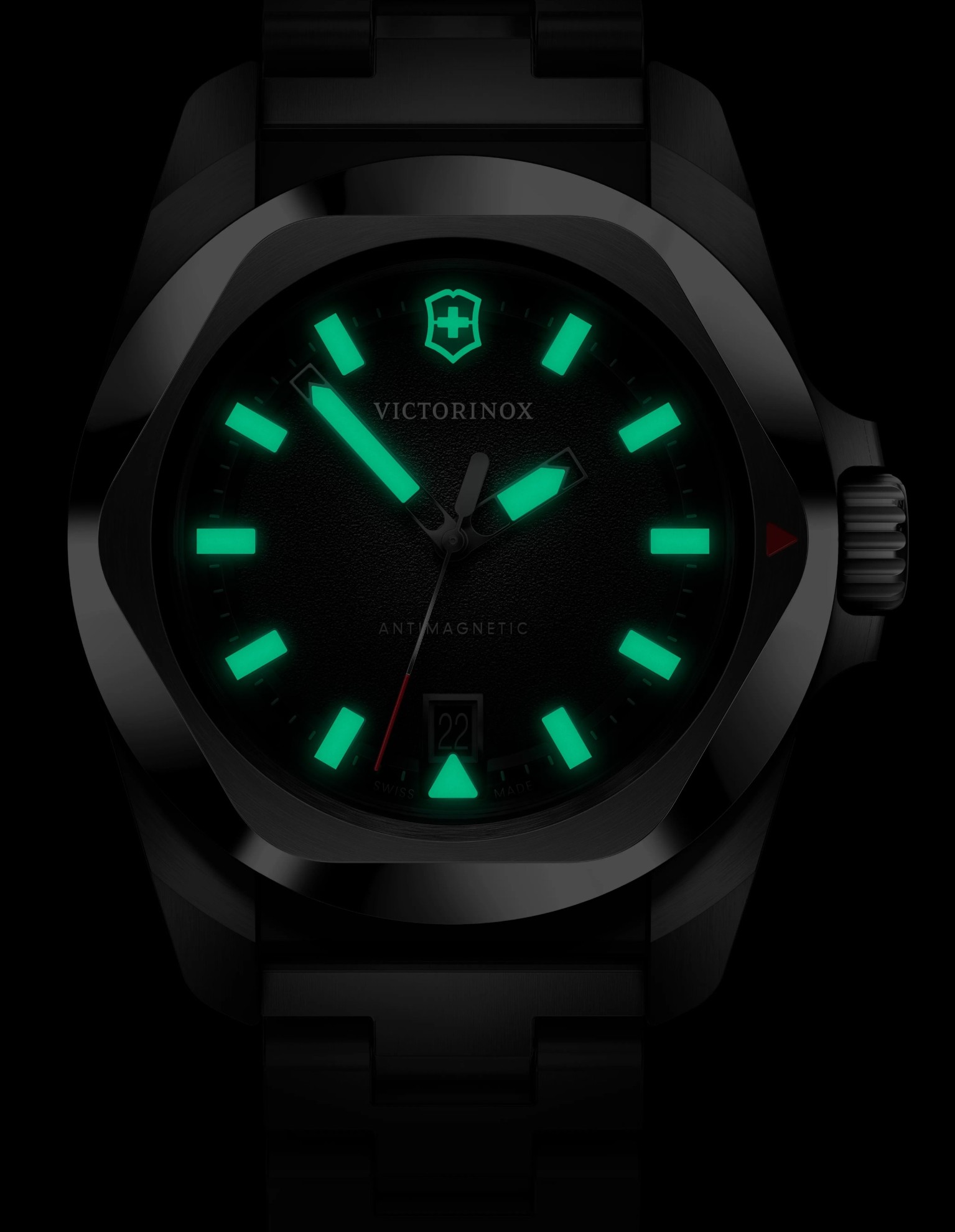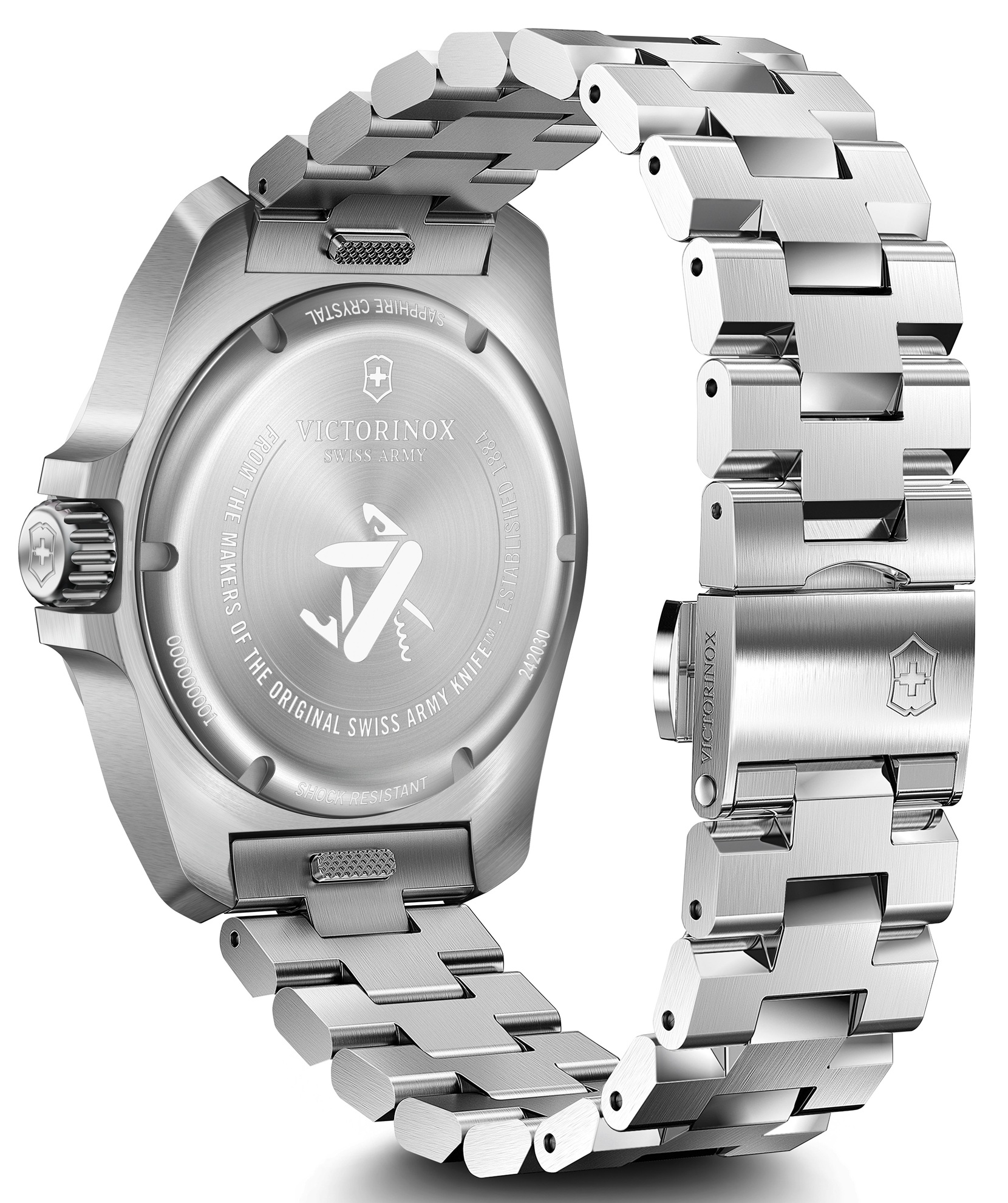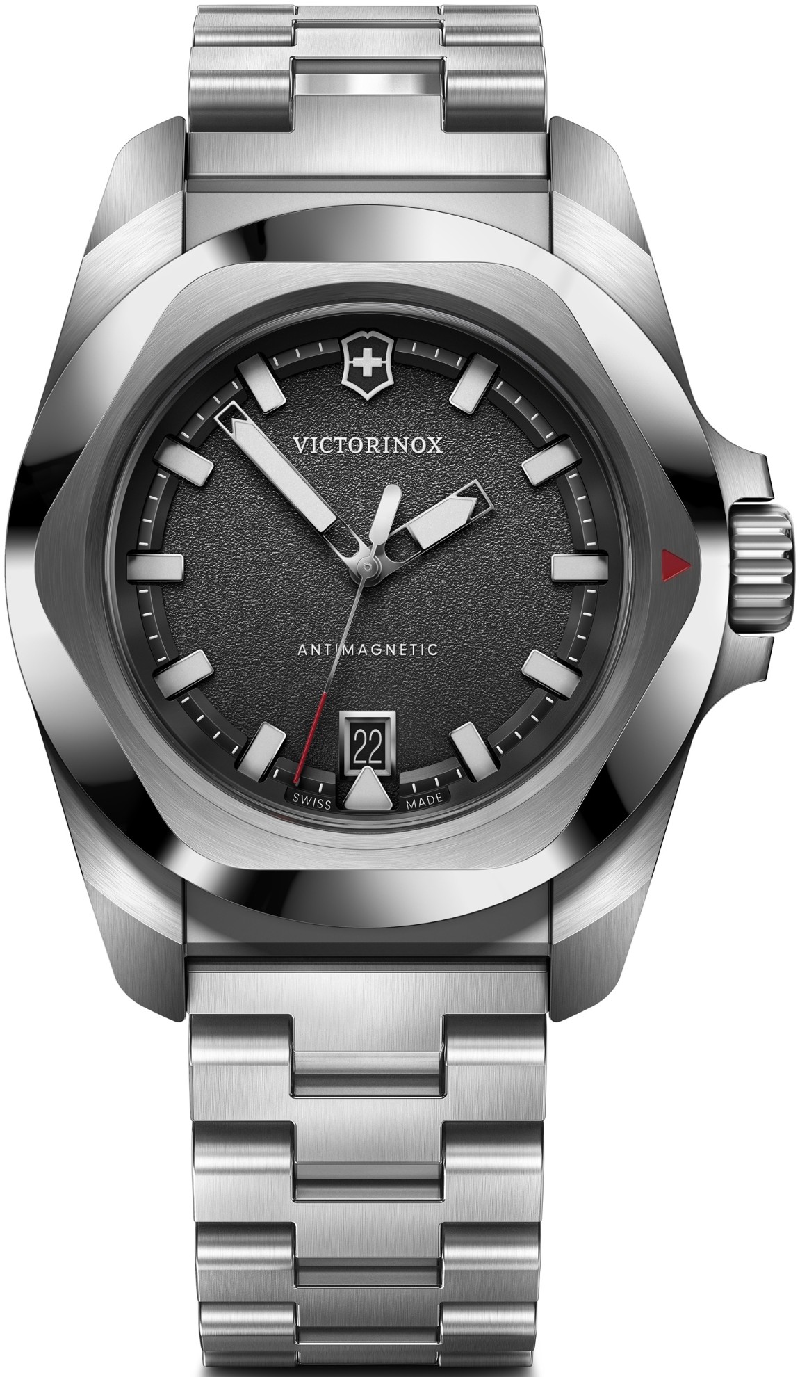 Victorinox I.N.O.X. 242030 sú pánske klasické batériové hodinky na oceľovom náramku s motýlikovou sponou. Puzdro z nerezovej ocele má priemer 41 milimetrov a skrutkovaciu korunku. Čierny textúrovaný číselník s ukazovateľom dátumu na šiestej hodine je chránený odolným zafírovým sklom s antireflexnou vrstvou. Ručičky a indexy pokrýva luminiscenčný náter Super-LumiNova®, ktorý po nasvietení garantuje perfektnú čitateľnosť za zhoršených svetelných podmienok. Pohon hodiniek zaisťuje švajčiarsky quartzový strojček Ronda 715. S vodotesnosťou 20 ATM sú hodinky vhodné pre hlbinné potápanie.