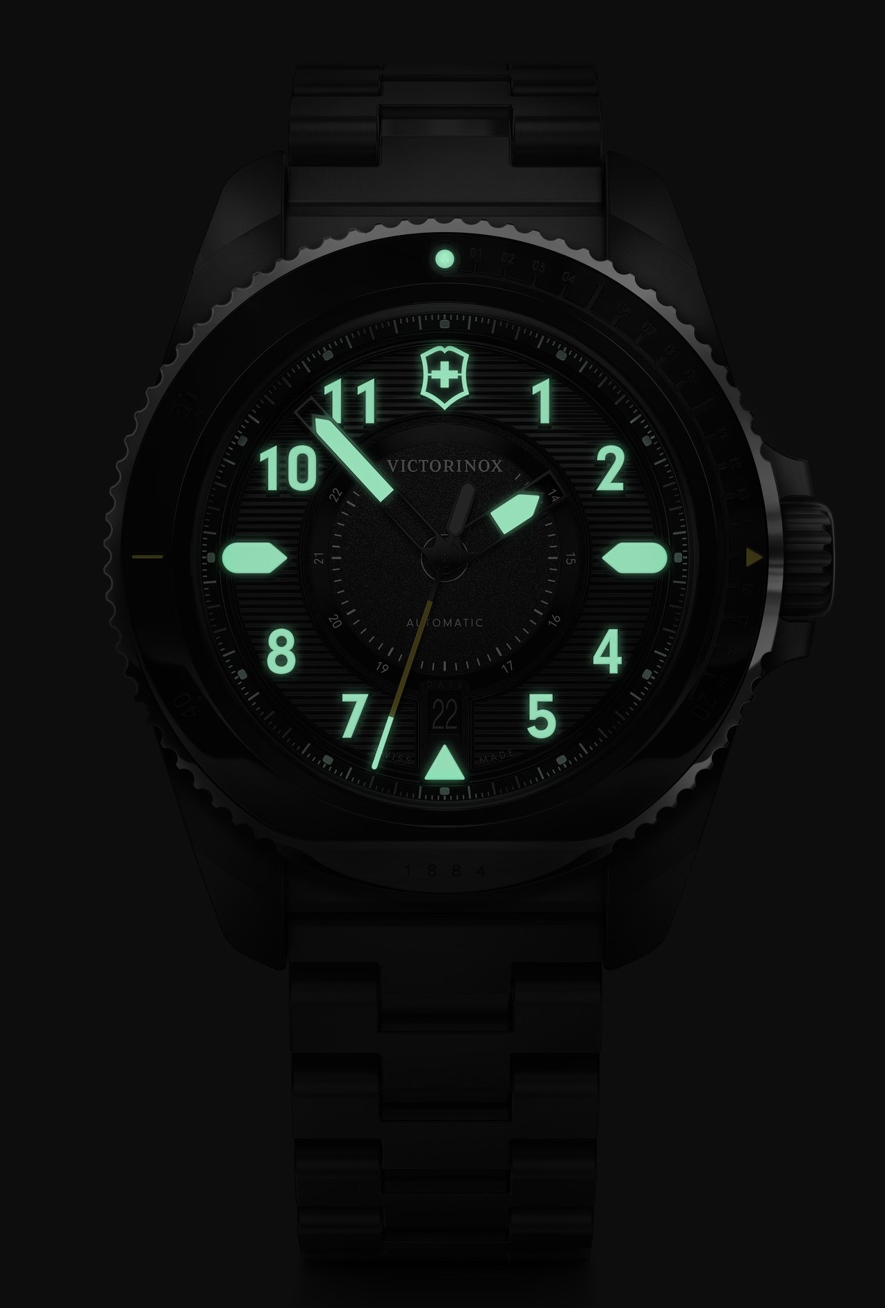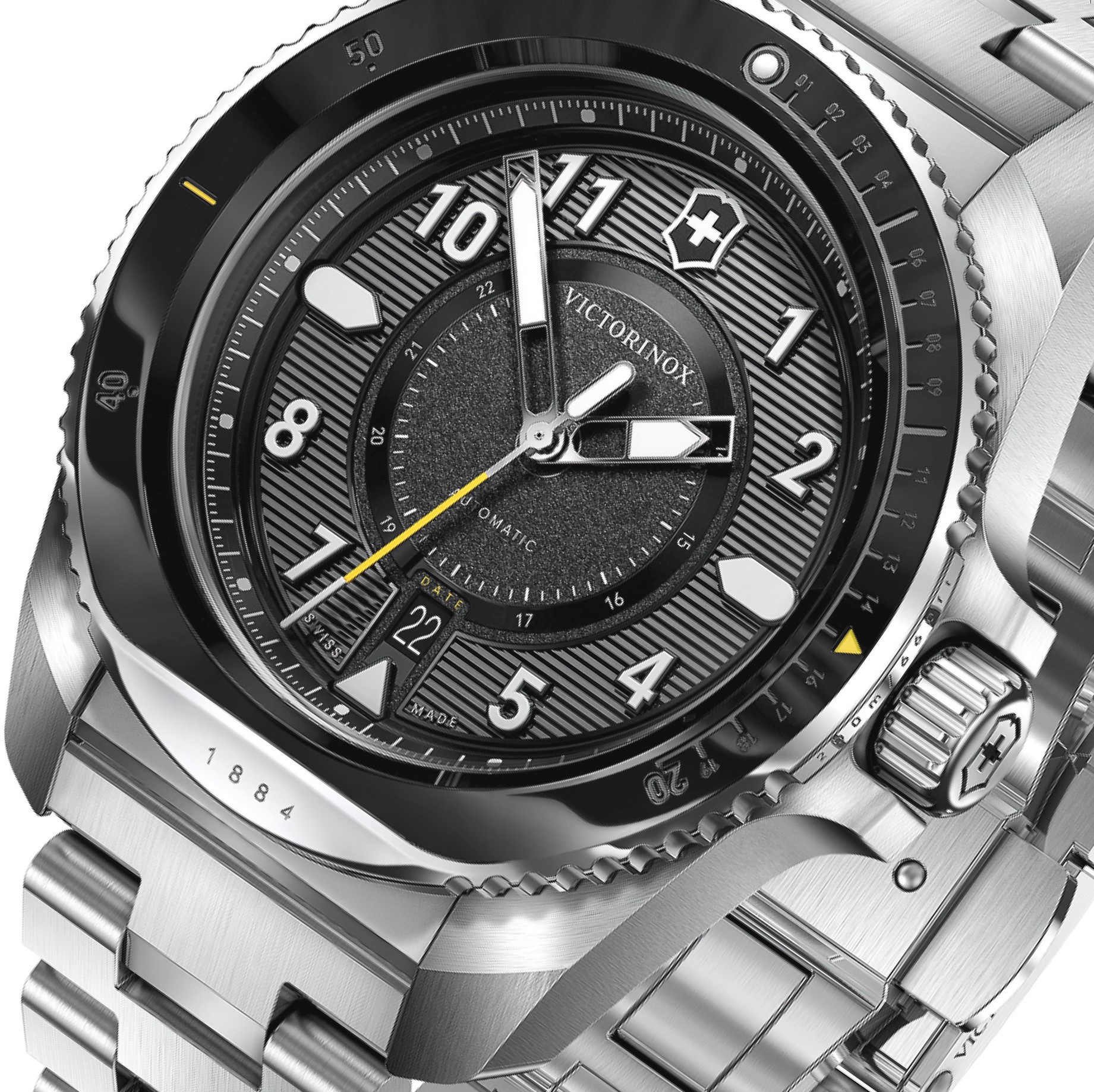 Victorinox Journey 1884 Automatic 241981 sú pánske automatické hodinky v klasickom štýle na oceľovom náramku s brúsenou povrchovou úpravou a motýlikovou sponou. Puzdro z nerezovej ocele má priemer 43 milimetrov, jednosmerne otočnú lunetu s čiernou keramickou vložkou, priehľadné viečko a skrutkovaciu korunku. Čierny textúrovaný číselník s 24-hodinovým formátom zobrazenia času a ukazovateľom dátumu je chránený odolným zafírovým sklom s antireflexnou vrstvou. Ručičky, indexy a bod na lunete pokrýva luminiscenčný náter SuperLuminova®, ktorý po nasvietení garantuje perfektnú čitateľnosť za zhoršených svetelných podmienok. Pohon hodiniek zaisťuje švajčiarsky mechanický strojček Sellita SW200-1 s automatickým náťahom a rezervou chodu 38 hodín. S vodotesnosťou 20 ATM sú hodinky vhodné pre hlbinné potápanie.