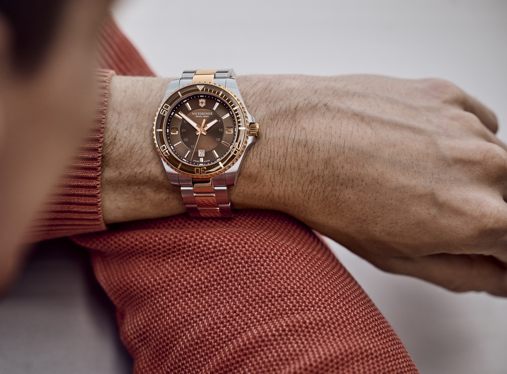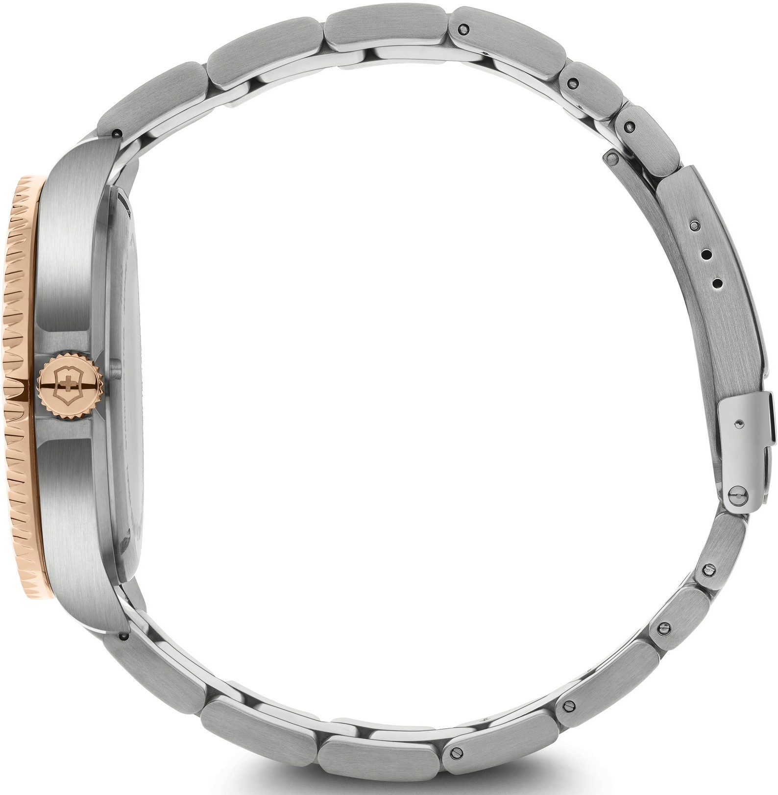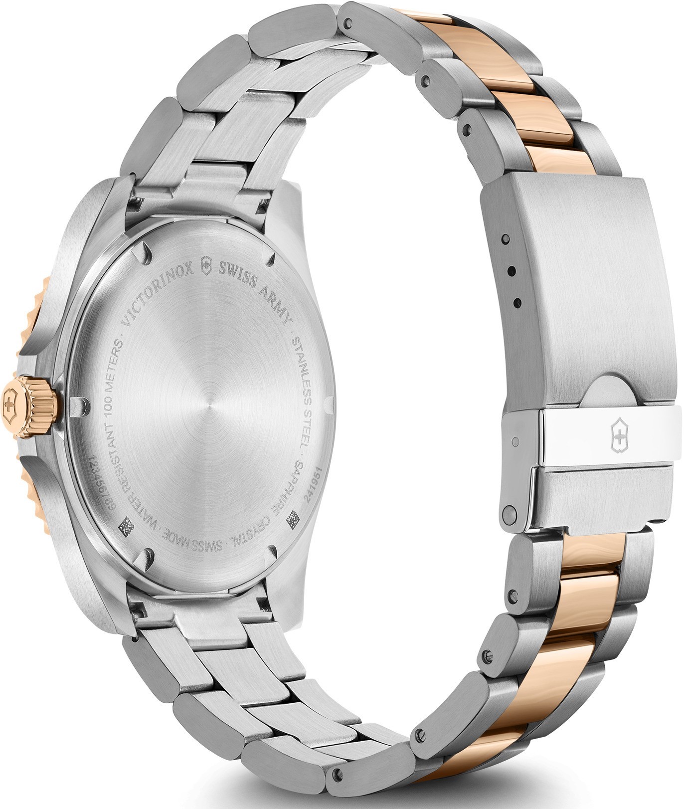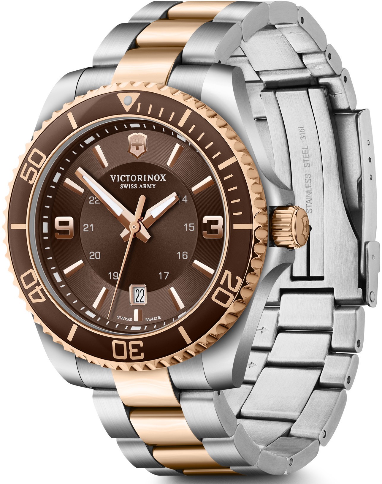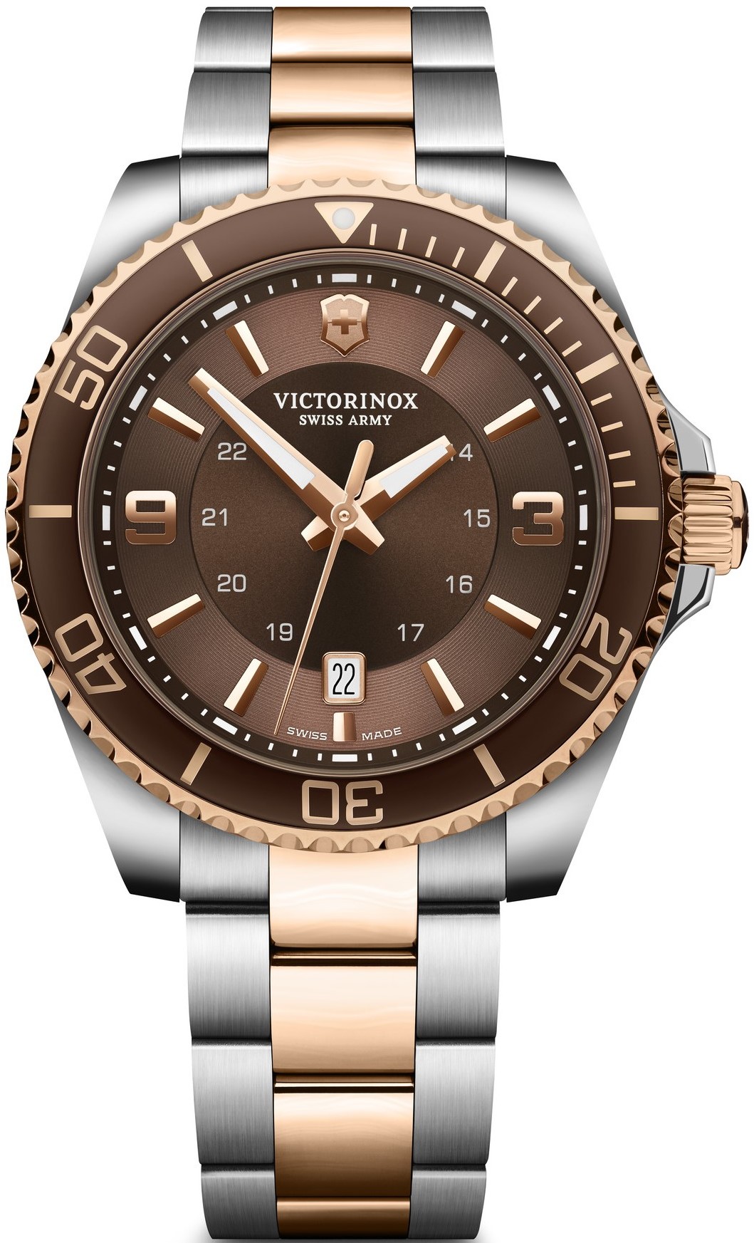 Victorinox Maverick 241951 sú pánske batériové hodinky na oceľovom bicolor náramku s preklápacou sponou. Prostredný rad náramku, luneta a korunka disponujú povrchovou PVD úpravou vo farbe ružového zlata. Puzdro z nerezovej ocele má priemer 43 milimetrov a jednosmerne otočnú lunetu. Hnedý číselník s efektom slnečného brusu, ukazovateľom dátumu a 24-hodinovým formátom zobrazenia času je chránený odolným zafírovým sklom s antireflexnou vrstvou. Ručičky a body pri indexoch pokrýva luminiscenčný náter SuperLuminova®, ktorý po nasvietení garantuje perfektnú čitateľnosť za zhoršených svetelných podmienok. Pohon hodiniek zaisťuje švajčiarsky quartzový strojček Ronda 715. S vodotesnosťou 10 ATM sú hodinky vhodné na plávanie a šnorchlovanie.