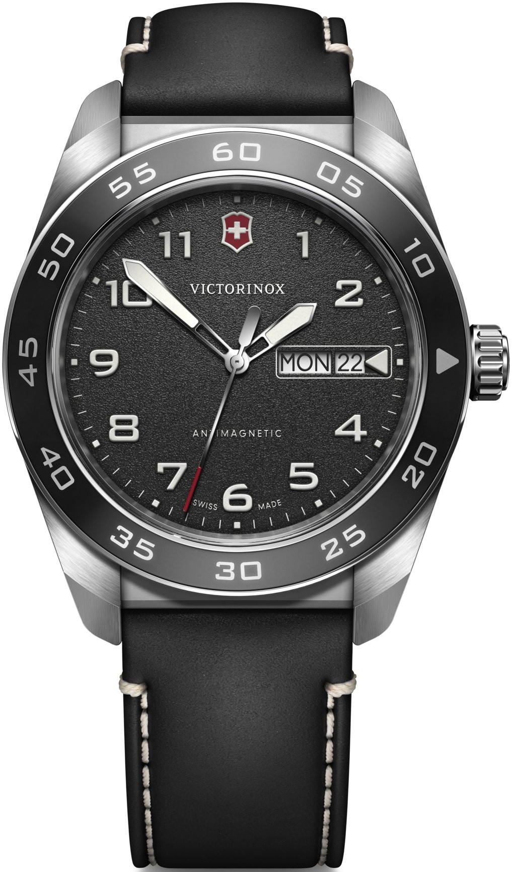Victorinox Swiss Army 242041 sú pánske elegantné batériové hodinky na čiernom koženom remienku s kontrastným prešívaním a tŕňovou sponou. Puzdro z nerezovej ocele má priemer 42 milimetrov a čiernu lunetu s minútovou stupnicou. Čierny textúrovaný číselník s ukazovateľom dátumu a dňa v týždni je chránený odolným zafírovým sklom. Ručičky a indexy pokrýva luminiscenčný náter SuperLuminova®, ktorý po nasvietení garantuje perfektnú čitateľnosť za zhoršených svetelných podmienok. Pohon hodiniek zaisťuje quartzový strojček Ronda 517. S vodotesnosťou 10 ATM sú hodinky vhodné na plávanie a šnorchlovanie.