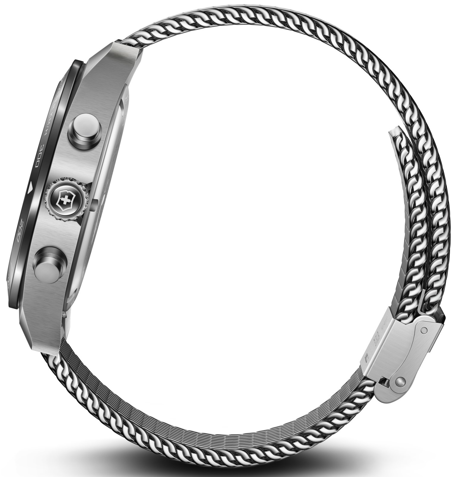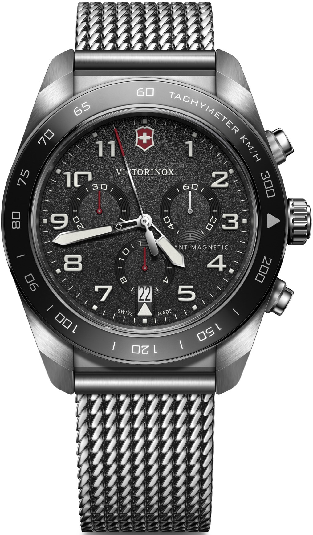 Victorinox Swiss Army Chrono 242048 sú pánske športové batériové hodinky na oceľovom milánskom ťahu s posuvnou sponou. Puzdro z nerezovej ocele má priemer 42 milimetrov a čiernu tachymetrickú lunetu. Čierny textúrovaný číselník s ukazovateľom dátumu a stopkami je chránený odolným zafírovým sklom. Ručičky a indexy pokrýva luminiscenčný náter SuperLuminova®, ktorý po nasvietení garantuje perfektnú čitateľnosť za zhoršených svetelných podmienok. Pohon hodiniek zaisťuje quartzový strojček Ronda 5030.D. S vodotesnosťou 10 ATM sú hodinky vhodné na plávanie a šnorchlovanie.