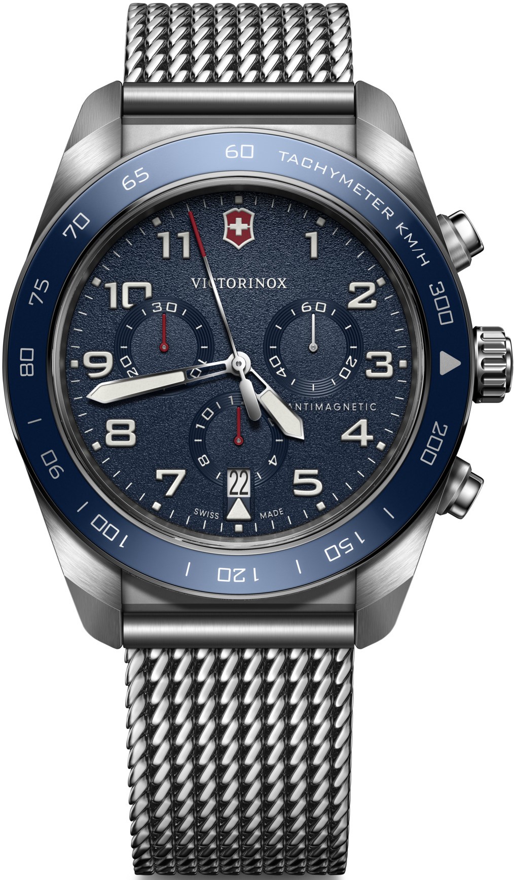 Victorinox Swiss Army Chrono 242049 sú pánske športové batériové hodinky na oceľovom milánskom ťahu s posuvnou sponou. Puzdro z nerezovej ocele má priemer 42 milimetrov a modrú tachymetrickú lunetu. Modrý textúrovaný číselník s ukazovateľom dátumu a stopkami je chránený odolným zafírovým sklom. Ručičky a indexy pokrýva luminiscenčný náter SuperLuminova®, ktorý po nasvietení garantuje perfektnú čitateľnosť za zhoršených svetelných podmienok. Pohon hodiniek zaisťuje quartzový strojček Ronda 5030.D. S vodotesnosťou 10 ATM sú hodinky vhodné na plávanie a šnorchlovanie.