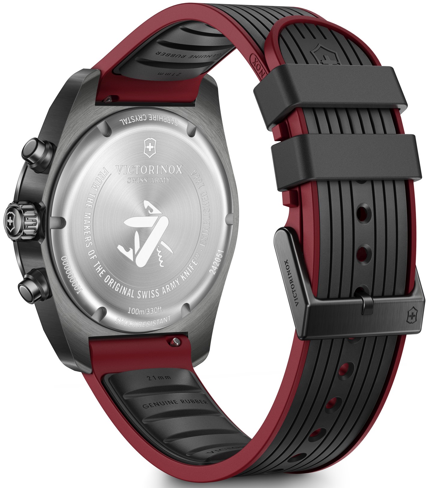 Victorinox Swiss Army Chrono 242051 sú pánske športové batériové hodinky na červeno-čiernom kaučukovom remienku s tŕňovou sponou. Puzdro z nerezovej ocele s povrchovou PVD úpravou čiernej farby má priemer 42 milimetrov a tachymetrickú lunetu. Čierny textúrovaný číselník s ukazovateľom dátumu a stopkami je chránený odolným zafírovým sklom. Ručičky a indexy pokrýva luminiscenčný náter SuperLuminova®, ktorý po nasvietení garantuje perfektnú čitateľnosť za zhoršených svetelných podmienok. Pohon hodiniek zaisťuje quartzový strojček Ronda 5030.D. S vodotesnosťou 10 ATM sú hodinky vhodné na plávanie a šnorchlovanie.